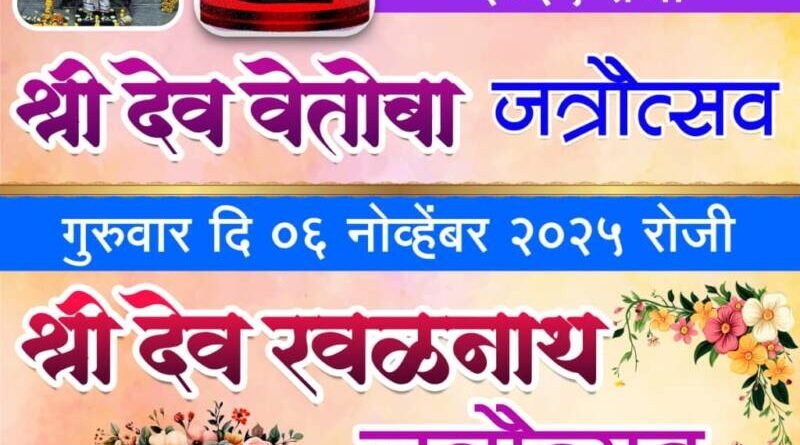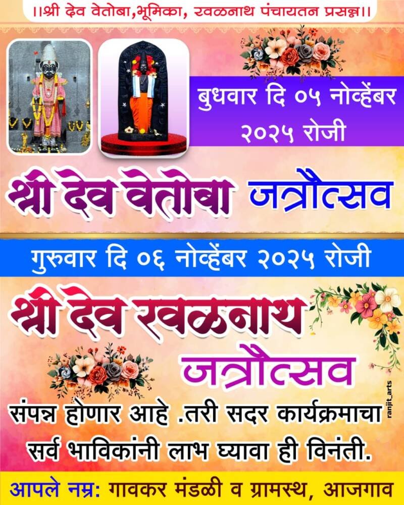 *ЁЯО┤рд╕рд╛рд╡рдВрддрд╡рд╛рдбреА, рджрд┐- режрей:-* рдЖрдЬрдЧрд╛рд╡рдЪреЗ рдЧреНрд░рд╛рдорджреИрд╡рдд рд╢реНрд░реА рд╡реЗрддреЛрдмрд╛ рджреЗрд╡рд╛рдЪрд╛ рд╡рд╛рд░реНрд╖рд┐рдХ рдЬрддреНрд░реЛрддреНрд╕рд╡ рдмреБрдзрд╡рд╛рд░ рджрд┐рдирд╛рдВрдХ рел рдиреЛрд╡реНрд╣реЗрдВрдмрд░ рд╡ рд╢реНрд░реА рджреЗрд╡ рд░рд╡рд│рдирд╛рде рджреЗрд╡рд╛рдЪрд╛ рд╡рд╛рд░реНрд╖рд┐рдХ рдЬрддреНрд░реЛрддреНрд╕рд╡ рдЧреБрд░реБрд╡рд╛рд░ рджрд┐рдирд╛рдВрдХ рем рдиреЛрд╡реНрд╣реЗрдВрдмрд░ рд░реЛрдЬреА рд╣реЛрдд рдЕрд╕реВрди рдпрд╛ рджрд┐рд╡рд╢реА рдордВрджрд┐рд░рд╛рдд рд╕рдХрд╛рд│ рдкрд╛рд╕реВрди рдзрд╛рд░реНрдорд┐рдХ рдХрд╛рд░реНрдпрдХреНрд░рдо рддреНрдпрд╛рдирдВрддрд░ рдХреЗрд│реА ,рдирд╛рд░рд│ рдареЗрд╡рдгреЗ, рдирд╡рд╕ рдмреЛрд▓рдгреЗ – рдлреЗрдбрдгреЗ ,рдЧрд╛рд▒реНрд╣рд╛рдгреЗ рдЖрджреА рдХрд╛рд░реНрдпрдХреНрд░рдо рд╣реЛрдгрд╛рд░ рдЖрд╣реЗрдд рддрд╕реЗрдЪ рд░рд╛рддреНрд░реМ рдЖрдЬрдЧрд╛рд╡рдХрд░ рджрд╢рд╛рд╡рддрд╛рд░ рдирд╛рдЯреНрдп рдордВрдбрд│рд╛рдЪрд╛ рдирд╛рдЯреНрдп рдкреНрд░рдпреЛрдЧ рд╣реЛрдгрд╛рд░ рдЖрд╣реЗ.