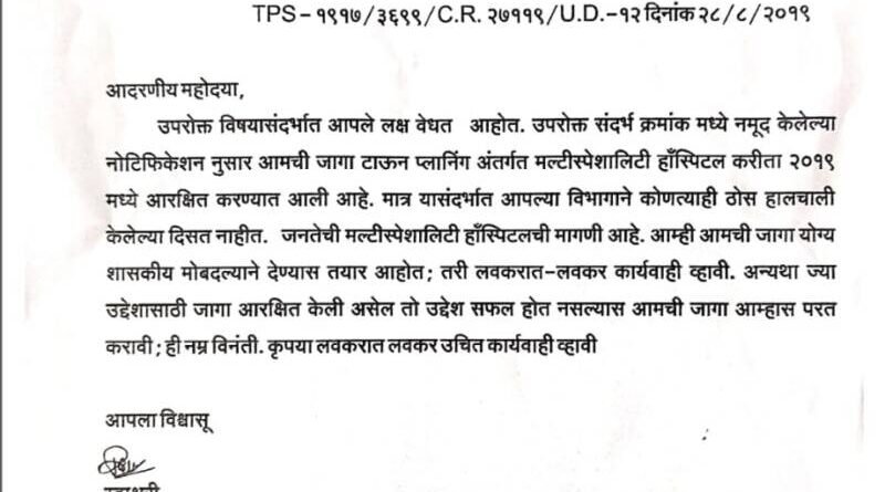 рдпрд╛ рдкрддреНрд░рд╛рдд рддреЗ рдореНрд╣рдгрддрд╛рдд, рдорд▓реНрдЯреАрд╕реНрдкреЗрд╢рд╛рд▓рд┐рдЯреА рд╣рд╛рдБрд╕реНрдкрд┐рдЯрд▓ рд╡реНрд╣рд╛рд╡реЗ, рд╣реА рдЬрдирддреЗрдЪреА рдорд╛рдЧрдгреА рдЖрд╣реЗ. рддрд╕рд╛ рднреВрдЦрдВрдб рдЖрд░рдХреНрд╖рд┐рдд рдЖрд╣реЗ. рдЬрд╛рдЧрд╛ рдорд╛рд▓рдХ рдпреЛрдЧреНрдп рд╢рд╛рд╕рдХреАрдп рдореЛрдмрджрд▓реНрдпрд╛рдиреЗ рдЬрд╛рдЧрд╛ рджреЗрдгреНрдпрд╛рд╕ рддрдпрд╛рд░ рдЖрд╣реЗрдд. рдпрд╛рдмрд╛рдмрдд рд▓рд╡рдХрд░рд╛рдд-рд▓рд╡рдХрд░ рдХрд╛рд░реНрдпрд╡рд╛рд╣реА рд╡реНрд╣рд╛рд╡реА. рдЕрдиреНрдпрдерд╛ рдЬреНрдпрд╛ рдЙрджреНрджреЗрд╢рд╛рд╕рд╛рдареА рдЬрд╛рдЧрд╛ рдЖрд░рдХреНрд╖рд┐рдд рдЖрд╣реЗ рддреЛ рдЙрджреНрджреЗрд╢ рд╕рдлрд▓ рд╣реЛрдд рдирд╕рд▓реНрдпрд╛рд╕ рдЖрдордЪреА рдЬрд╛рдЧрд╛ рдЖрдореНрд╣рд╛рд▓рд╛ рдкрд░рдд рдХрд░рд╛рд╡реА.
