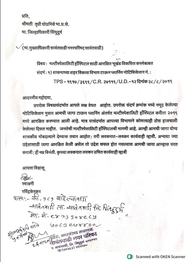 рд╢рд╛рд╕рдирд╛рдЪреНрдпрд╛ рдЯрд╛рдКрди рдкреНрд▓рд╛рдирд┐рдВрдЧ рд╡рд┐рднрд╛рдЧрд╛рдиреЗ рдиреЛрдЯрд┐рдлрд┐рдХреЗрд╢рди рдХрд╛рдвреВрди 2019 рдордзреНрдпреЗ рд╢реНрд░реА.рд░рд╡рд┐рдВрджреНрд░ рдХреЗрд░рдХрд░ рдпрд╛рдВрдЪреНрдпрд╛рд╕рд╣ рдЖрдЬреВрдмрд╛рдЬреВрдЪреА рджреЛрди рд╣реЗрдХреНрдЯрд░ рдЬрд╛рдЧрд╛ рдЕрдзрд┐рдХреГрддреНрдпрд╛ рдЖрд░рдХреНрд╖рд┐рдд рдХреЗрд▓реА. “рдЖрд░рдХреНрд╖рдг рдХреНрд░.5рдЕ” рд╕рдВрджрд░реНрднрд╛рдд рдЬрд╛рдЧрд╛ рдорд╛рд▓рдХ рдХреЗрд░рдХрд░ рдпрд╛рдВрдиреА рдкрддреНрд░рд╡реНрдпрд╡рд╣рд╛рд░ рдХреЗрд▓рд╛. рдорд╛рддреНрд░ рдЧреЗрд▓реА рд╕рд╣рд╛ рд╡рд╖реЗрдБ рдорд▓реНрдЯреАрд╕реНрдкреЗрд╢рд╛рд▓рд┐рдЯреА рд╣рд╛рдБрд╕реНрдкрд┐рдЯрд▓ рд╕рдВрджрд░реНрднрд╛рдд рднреВрдЦрдВрдб рд╡рд┐рдХрд╕рд┐рдд рдХрд░рдгреНрдпрд╛рдмрд╛рдмрдд рдХреЛрдгрддреНрдпрд╛рд╣реА рд╣рд╛рд▓рдЪрд╛рд▓реА рдЭрд╛рд▓реЗрд▓реНрдпрд╛ рдирд╛рд╣реАрдд. рднреВрдЦрдВрдб рд╢рд╛рд╕рдирд╛рдиреЗ рдЖрд░рдХреНрд╖рд┐рдд рдХрд░реБрди рдареЗрд╡рд▓реНрдпрд╛рдиреЗ рдЬрдорд┐рди рдорд╛рд▓рдХрд╛рдВрдирд╛ рддреНрдпрд╛рд╡рд░ рдЕрдиреНрдп рдХрд╛рд╣реА рдХрд░рддрд╛ рдпреЗрдд рдирд╛рд╣реА рдЖрдгрд┐ рд╢рд╛рд╕рди рд╕реБрдзреНрджрд╛ рд╣рд╛рдБрд╕реНрдкрд┐рдЯрд▓ рдЙрднрд╛рд░рдгреАрдЪреНрдпрд╛ рд╣рд╛рд▓рдЪрд╛рд▓реА рдХрд░рдд рдирд╛рд╣реА. рддреНрдпрд╛рдореБрд│реЗ рд╡реИрддрд╛рдЧреВрди рдЬрд╛рдКрди рдЬрд╛рдЧрд╛ рдорд╛рд▓рдХрд╛рдВрдиреА рдПрдХ рддрд░ рдЬрд╛рдЧрд╛ рд╡рд┐рдХрд╕рд┐рдд рдХрд░рд╛ рдЕрдиреНрдпрдерд╛ рдкрд░рдд рджреНрдпрд╛ рдЕрд╢реА рдорд╛рдЧрдгреА рдХрд░рдгрд╛рд░реЗ рдкрддреНрд░ рдЖрдЬ рд╕рд╛рд╡рдВрддрд╡рд╛рдбреА рдирдЧрд░рдкрд░рд┐рд╖рдж рдореБрдЦреНрдпрд╛рдзрд┐рдХрд╛рд░реА рдЖрдгрд┐ рдЬрд┐рд▓реНрд╣рд╛рдзрд┐рдХрд╛рд░реА рддреГрдкреНрддреА рдзреЛрдбрдорд┐рд╕реЗ, рдЬрд┐рд▓реНрд╣рд╛ рд╢рд▓реНрдпрдЪрд┐рдХрд┐рддреНрд╕рдХ рдбреЙ. рд╢реНрд░реАрдкрд╛рдж рдкрд╛рдЯреАрд▓ рдпрд╛рдВрдирд╛ рдкрд╛рдард╡рд▓реЗ рдЖрд╣реЗ.