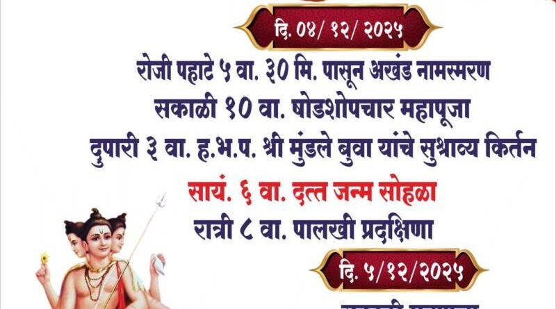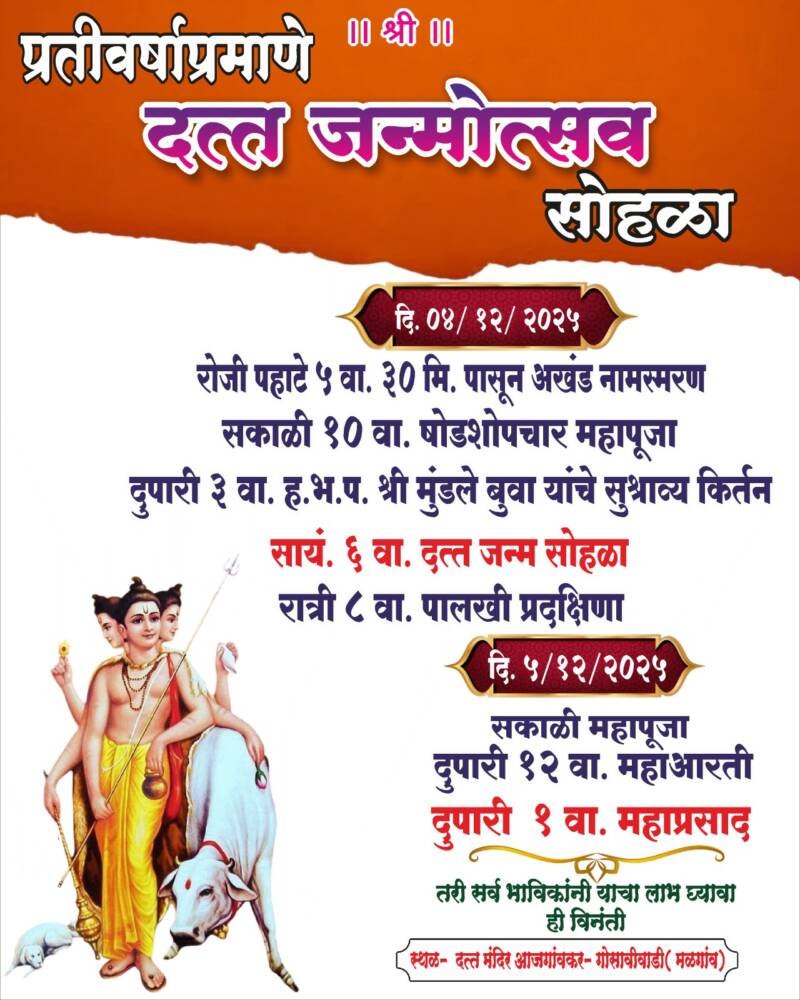 *ЁЯЫСрдорд│рдЧрд╛рд╡ рдЖрдЬрдЧрд╛рд╡рдХрд░ рдпреЗрдереАрд▓ рджрддреНрдд рдордВрджрд┐рд░ рдпреЗрдереЗ рдЙрджреНрдпрд╛ рджрддреНрдд рдЬрдиреНрдореЛрддреНрд╕рд╡ рд╕реЛрд╣рд│рд╛.*