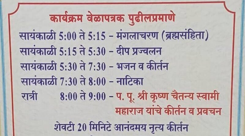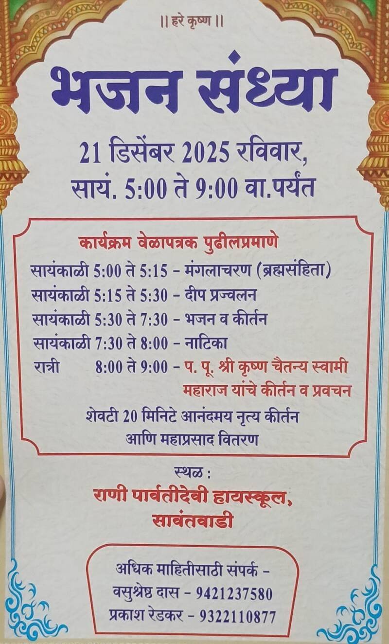 *ЁЯО┤рд╕рд╛рд╡рдВрддрд╡рд╛рдбреА, рджрд┐- резреп:-* рд╕рд╛рд╡рдВрддрд╡рд╛рдбреА рдЗрд╕реНрдХреЙрди рдпрд╛рдВрдЪреНрдпрд╛рд╡рддреАрдиреЗ рд░рд╡рд┐рд╡рд╛рд░реА рднрдЬрди рд╕рдВрдзреНрдпрд╛ рдХрд╛рд░реНрдпрдХреНрд░рдорд╛рдЪреЗ рд░рд╛рдгреА рдкрд╛рд░реНрд╡рддреАрджреЗрд╡реА рд╣рд╛рдпрд╕реНрдХреВрд▓, рд╕рд╛рд╡рдВрддрд╡рд╛рдбреА рдпреЗрдереЗ рдЖрдпреЛрдЬрди рдХрд░рдгреНрдпрд╛рдд рдЖрд▓реЗ рдЖрд╣реЗ.рд╕рд╛рдпрдВрдХрд╛рд│реА рел рддреЗ рел.резрел рдордВрдЧрд▓рд╛рдЪрд░рдг (рдмреНрд░рд╣реНрдорд╕рдВрд╣рд┐рддрд╛),рд╕рд╛рдпрдВрдХрд╛рд│реА рел.резрел рддреЗ рел.рейреж рджреАрдк рдкреНрд░рдЬреНрд╡рд▓рди,рд╕рд╛рдпрдВрдХрд╛рд│реА рел.рейреж рддреЗ рен. рейреж рднрдЬрди рд╡ рдХреАрд░реНрддрди,рд╕рд╛рдпрдВрдХрд╛рд│реА рен.рейреж рддреЗ рео. режреж рдирд╛рдЯрд┐рдХрд╛,рд░рд╛рддреНрд░реА рео.режреж рддреЗ реп. режреж рдк. рдкреВ. рд╢реНрд░реА рдХреГрд╖реНрдг рдЪреИрддрдиреНрдп рд╕реНрд╡рд╛рдореА рдорд╣рд╛рд░рд╛рдЬ рдпрд╛рдВрдЪреЗ рдХреАрд░реНрддрди рд╡ рдкреНрд░рд╡рдЪрди,рд╢реЗрд╡рдЯреА реиреж рдорд┐рдирд┐рдЯреЗ рдЖрдирдВрджрдордп рдиреГрддреНрдп рдХреАрд░реНрддрди рдЖрдгрд┐ рдорд╣рд╛рдкреНрд░рд╕рд╛рдж рд╡рд┐рддрд░рдг рд╣реЛрдгрд╛рд░ рдЖрд╣реЗ.рддрд░реАрд╣реА рд╕рд░реНрд╡ рднрдХреНрддрд╛рдВрдиреА рд╣реНрдпрд╛ рдХрд╛рд░реНрдпрдХреНрд░рдорд╛рдд рд╕рд╣рднрд╛рдЧреА рд╡реНрд╣рд╛рд╡реЗ рдЕрд╕рдВ рдЖрд╡рд╛рд╣рди рд╕рд╛рд╡рдВрддрд╡рд╛рдбреА рдЗрд╕реНрдХреЙрди рдЪреНрдпрд╛ рд╡рддреАрдиреЗ рдХрд░рдгреНрдпрд╛рдд рдЖрд▓реЗ рдЖрд╣реЗ.