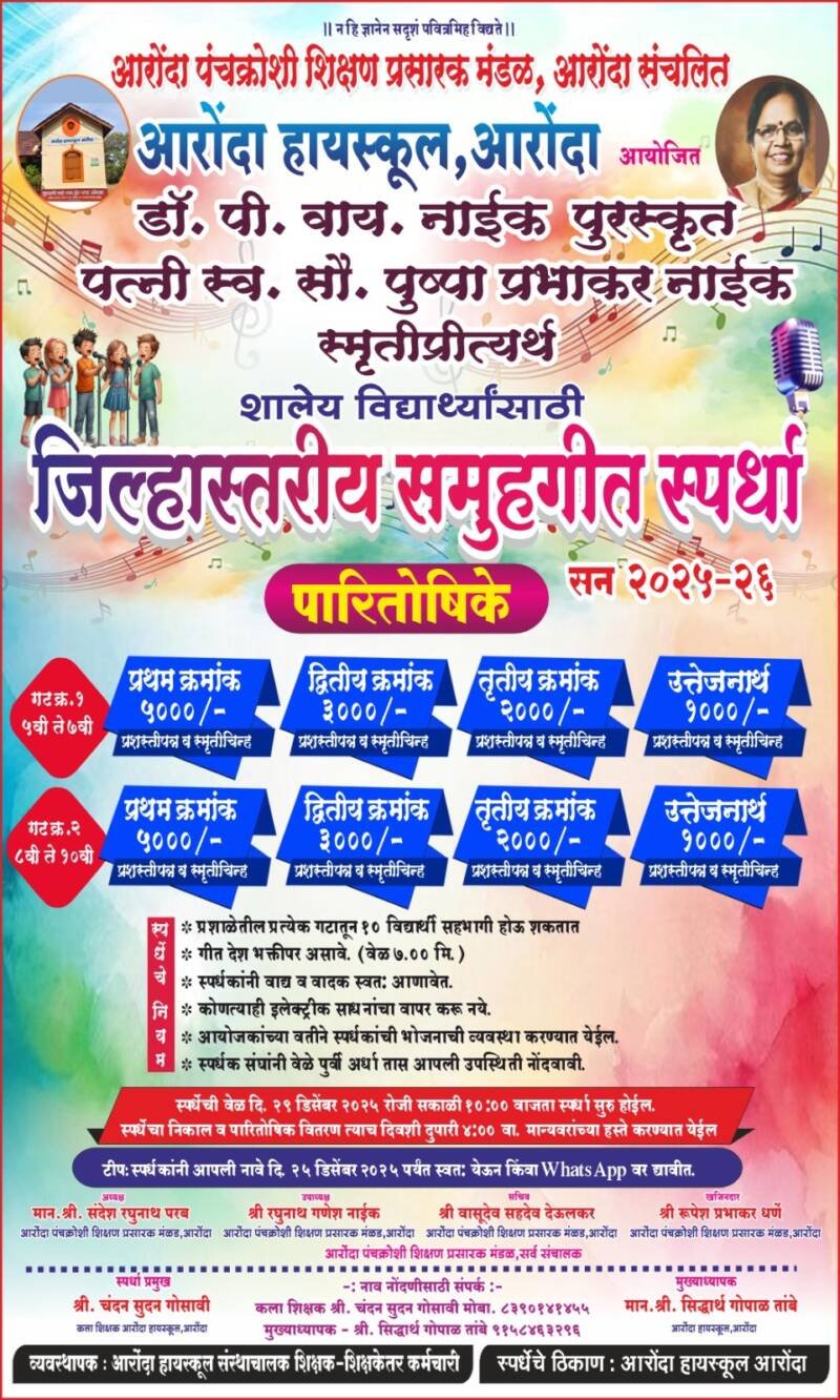 *🎴सावंतवाडी, दि- २४:-* आरोंदा हायस्कूल येथे डॉ.पी.वाय.नाईक पुरस्कृत पत्नी स्व.पुष्पा प्रभाकर नाईक स्मृती प्रित्यर्थ जिल्हास्तरीय समूहगीत स्पर्धेचे आयोजन करण्यात आले असून स्पर्धा दोन गटात होणार आहे.