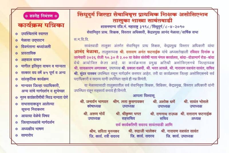 *ЁЯО┤рд╕рд╛рд╡рдВрддрд╡рд╛рдбреА, рджрд┐- реиреп:-* рд╡рд┐рджреНрдпреЗрдЪрд╛ рджрд┐рд╡рд╛ рдЖрдпреБрд╖реНрдпрднрд░ рддреЗрд╡рдд рдареЗрд╡рдгрд╛рд░реЗ рдЧреБрд░реБрдЬрди рдХрдзреА рдирд┐рд╡реГрддреНрдд рд╣реЛрдд рдирд╛рд╣реАрдд, рддреЗ рдХреЗрд╡рд│ рдЕрдзреНрдпрд╛рдкрдирд╛рддреВрди рд╡рд┐рд╢реНрд░рд╛рдВрддреА рдШреЗрддрд╛рддтАЭ рдпрд╛ рднрд╛рд╡рдиреЗрддреВрди рд╕рд┐рдВрдзреБрджреБрд░реНрдЧ рдЬрд┐рд▓реНрд╣рд╛ рд╕реЗрд╡рд╛рдирд┐рд╡реГрддреНрдд рдкреНрд░рд╛рдердорд┐рдХ рд╢рд┐рдХреНрд╖рдХ рдЕрд╕реЛрд╕рд┐рдПрд╢рди, рд╕рд╛рд╡рдВрддрд╡рд╛рдбреА рд╢рд╛рдЦреЗрдЪрд╛ рдЖрдирдВрдж рдореЗрд│рд╛рд╡рд╛ рд░рд╡рд┐рд╡рд╛рд░, рек рдЬрд╛рдиреЗрд╡рд╛рд░реА рд░реЛрдЬреА рдмрд╛рдВрджрд╛ рдпреЗрдереАрд▓ рд╕рдВрддреЛрд╖реА рдорд╛рддрд╛ рдордВрдЧрд▓ рдХрд╛рд░реНрдпрд╛рд▓рдпрд╛рдд рдЖрдпреЛрдЬрд┐рдд рдХрд░рдгреНрдпрд╛рдд рдЖрд▓рд╛ рдЖрд╣реЗ.