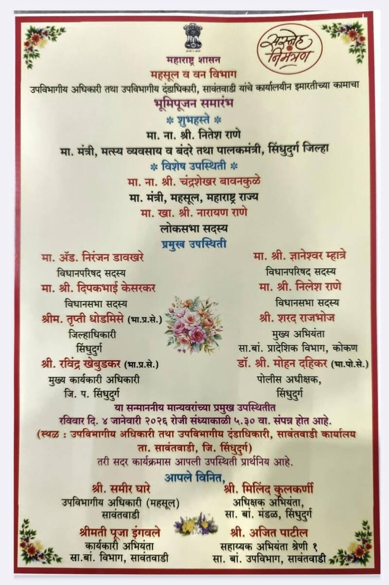 _*ЁЯТлрд╕рд╛рд╡рдВрддрд╡рд╛рдбреА рдпреЗрдереАрд▓ рдЙрдкрд╡рд┐рднрд╛рдЧреАрдп рдЕрдзрд┐рдХрд╛рд░реА (SDO) рддрдерд╛ рдЙрдкрд╡рд┐рднрд╛рдЧреАрдп рджрдВрдбрд╛рдзрд┐рдХрд╛рд░реА рдпрд╛рдВрдЪреНрдпрд╛ рднрд╡реНрдп рдиреВрддрди рдХрд╛рд░реНрдпрд╛рд▓рдпреАрди рдЗрдорд╛рд░рддреАрдЪрд╛ ‘рднреВрдорд┐рдкреВрдЬрди рд╕рдорд╛рд░рдВрдн’ рд╕рдВрдкрдиреНрди рд╣реЛрдд рдЖрд╣реЗ. рдпрд╛ рдордВрдЧрд▓рдкреНрд░рд╕рдВрдЧреА рдЖрдкрд▓реА рдЙрдкрд╕реНрдерд┐рддреА рдкреНрд░рд╛рд░реНрдердиреАрдп рдЖрд╣реЗ…!!ЁЯе│*_