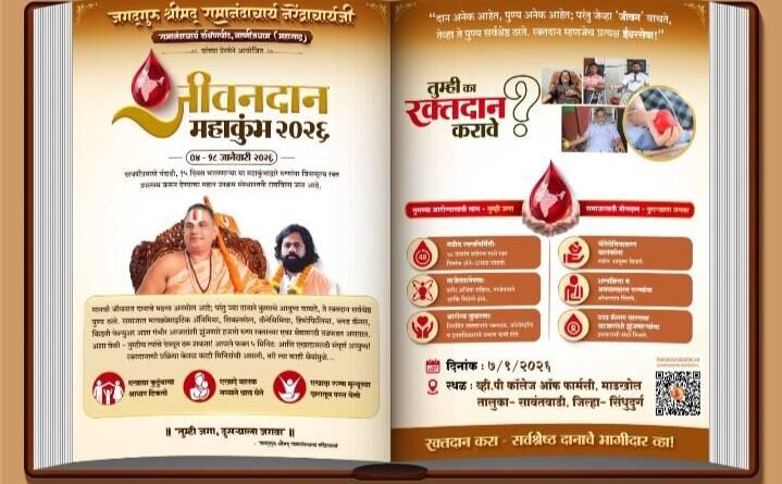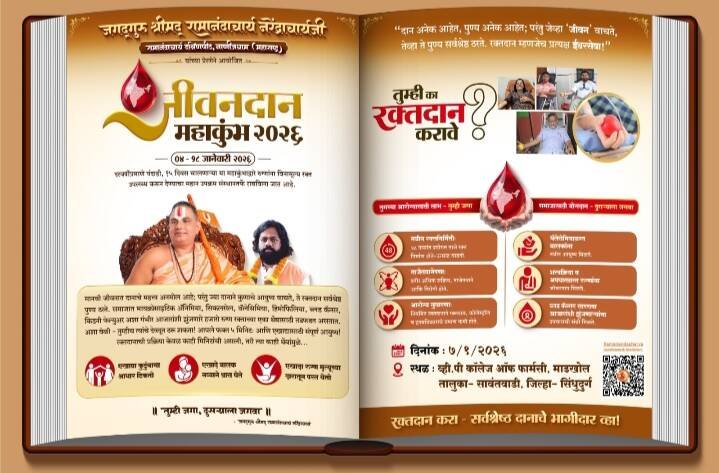 *ЁЯО┤рд╕рд╛рд╡рдВрддрд╡рд╛рдбреА, рджрд┐- режрел:-* рдЬрдЧрджреНрдЧрдЧреБрд░реВ рд╢реНрд░реАрдорджреН рд░рд╛рдорд╛рдирдВрджрд╛рдЪрд╛рд░реНрдп рдирд░реЗрдВрджреНрд░рдЪрд╛рд░реНрдпрдЬреА рд╕рдВрд╕реНрдерд╛рди рдирд╛рдгреАрдЬрдзрд╛рдо рдпрд╛рдВрдЪреНрдпрд╛ рд╕рд╛рд╡рдВрддрд╡рд╛рдбреА рддрд╛рд▓реБрдХреНрдпрд╛рддреАрд▓ рдорд╛рдбрдЦреЛрд▓ рд╕реЗрд╡рд╛ рдХреЗрдВрджреНрд░рд╛рдЪреНрдпрд╛ рд╡рддреАрдиреЗ рд╡реНрд╣реА рдкреА рдХреЙрд▓реЗрдЬ рдСрдл рдлрд╛рд░реНрдорд╕реА рдорд╛рдбрдЦреЛрд▓, рддрд╛. рд╕рд╛рд╡рдВрддрд╡рд╛рдбреА рдпреЗрдереЗ 7 рдЬрд╛рдиреЗрд╡рд╛рд░реА 2026 рд░реЛрдЬреА рд░рдХреНрддрджрд╛рди рд╢рд┐рдмреАрд░ рдЖрдпреЛрдЬрд┐рдд рдХрд░рдгреНрдпрд╛рдд рдЖрд▓реЗ рдЖрд╣реЗ. рдорд╛рдирд╡реА рдЬреАрд╡рдирд╛рдд рд░рдХреНрддрджрд╛рдирд╛рд▓рд╛ рдЕрдирдиреНрдпрд╕рд╛рдзрд╛рд░рдг рдорд╣рддреНрддреНрд╡ рдЖрд╣реЗ, рдпрд╛ рджрд╛рдирд╛рдиреЗ рдорд╛рдгрд╕рд╛рдЪреЗ рдЖрдпреБрд╖реНрдп рд╡рд╛рдЪрддреЗ, рджрд░рд╡рд░реНрд╖реА рдкреНрд░рдорд╛рдгреЗ рдпрдВрджрд╛рд╣реА рдЬреАрд╡рдирджрд╛рди рдорд╣рд╛рдХреБрдВрдн 2026 рдЕрдВрддрд░реНрдЧрдд рдард┐рдХрдард┐рдХрд╛рдгреА рд░рдХреНрддрджрд╛рди рд╢рд┐рдмреАрд░ рдЖрдпреЛрдЬрд┐рдд рдХрд░рдгреНрдпрд╛рдд рдпреЗрдгрд╛рд░ рдЖрд╣реЗрдд. рдпрд╛ рд░рдХреНрддрджрд╛рди рд╢рд┐рдмрд┐рд░рд╛рдд рдЬрд╛рд╕реНрддреАрдд рдЬрд╛рд╕реНрдд рд░рдХреНрддрджрд╛рддреНрдпрд╛рдВрдиреА рд╕рд╣рднрд╛рдЧреА рд╡реНрд╣рд╛рд╡реЗ рдЕрд╕реЗ рдЖрд╡рд╛рд╣рди рдЬрдЧрддрдЧреБрд░реБ рдирд░реЗрдВрджреНрд░рд╛рдЪрд╛рд░реНрдп рд╕рдВрд╕реНрдерд╛рди рдирд╛рдгреАрдЬрдзрд╛рдо,рдорд╛рдбрдЦреЛрд▓ рд╕реЗрд╡рд╛ рдХреЗрдВрджреНрд░ рдпрд╛рдВрдЪреНрдпрд╛ рд╡рддреАрдиреЗ рдХрд░рдгреНрдпрд╛рдд рдпреЗрдд рдЖрд╣реЗ.