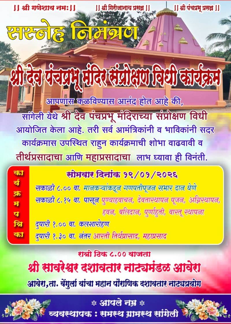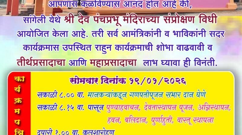 *ЁЯО┤рд╕рд╛рд╡рдВрддрд╡рд╛рдбреА, рджрд┐- резрен:-* рд╕рд╛рдВрдЧреЗрд▓реА рдпреЗрдереАрд▓ рд╢реНрд░реА рдкрдВрдЪрдкреНрд░рднреВ рдордВрджрд┐рд░рд╛рдЪрд╛ рд╕рдВрдкреНрд░реЛрдХреНрд╖рдг рд╡рд┐рдзреА рдХрд╛рд░реНрдпрдХреНрд░рдо рд╕реЛрдорд╡рд╛рд░ рджрд┐рдирд╛рдВрдХ резреп рдЬрд╛рдиреЗрд╡рд╛рд░реА реирежреирем рд░реЛрдЬреА рдЖрдпреЛрдЬрд┐рдд рдХрд░рдгреНрдпрд╛рдд рдЖрд▓рд╛ рдЕрд╕реВрди,рдпрд╛ рджрд┐рд╡рд╢реА рдордВрджрд┐рд░рд╛рдд рд╡рд┐рд╡рд┐рдз рдзрд╛рд░реНрдорд┐рдХ рдХрд╛рд░реНрдпрдХреНрд░рдо рдЖрдпреЛрдЬрд┐рдд рдХрд░рдгреНрдпрд╛рдд рдЖрд▓реЗ рдЖрд╣реЗрдд.