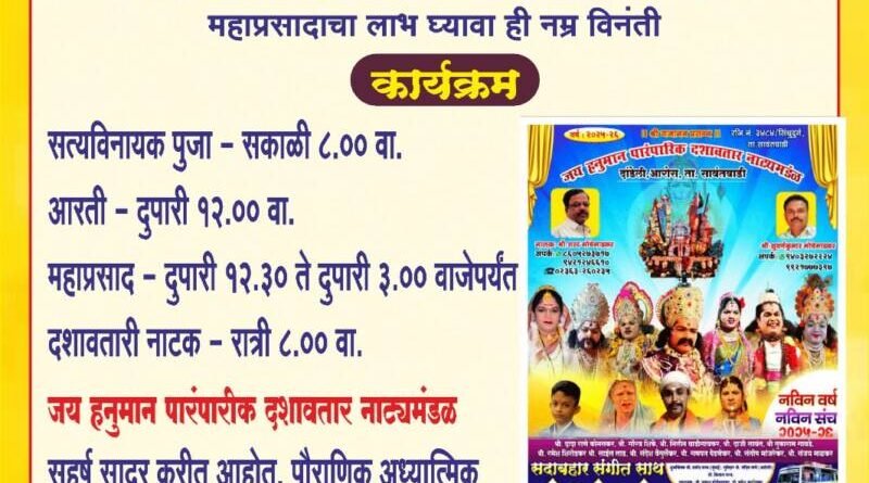 рд░рд╛рддреНрд░реА рд░рдВрдЧрдгрд╛рд░ рджрд╢рд╛рд╡рддрд╛рд░реА рдирд╛рдЯрдХ рдЙрддреНрд╕рд╡рд╛рдЪреЗ рдЦрд╛рд╕ рдЖрдХрд░реНрд╖рдг рдореНрд╣рдгрдЬреЗ рд░рд╛рддреНрд░реА рео:режреж рд╡рд╛рдЬрддрд╛ рд╣реЛрдгрд╛рд░рд╛ рд╕рд╛рдВрд╕реНрдХреГрддрд┐рдХ рдХрд╛рд░реНрдпрдХреНрд░рдо. рдпрд╛рд╡реЗрд│реА ‘рдЬрдп рд╣рдиреБрдорд╛рди рдкрд╛рд░рдВрдкрд░рд┐рдХ рджрд╢рд╛рд╡рддрд╛рд░ рдирд╛рдЯреНрдпрдордВрдбрд│’ рдпрд╛рдВрдЪреНрдпрд╛ рд╡рддреАрдиреЗ рдкреМрд░рд╛рдгрд┐рдХ рдЖрдзреНрдпрд╛рддреНрдорд┐рдХ рдирд╛рдЯреНрдпрдкреНрд░рдпреЛрдЧ рд╕рд╛рджрд░ рдХреЗрд▓рд╛ рдЬрд╛рдгрд╛рд░ рдЖрд╣реЗ. рдХреЛрдХрдгрдЪреНрдпрд╛ рдпрд╛ рд▓реЛрдХрдХрд▓реЗрдЪрд╛ рдЖрдирдВрдж рдШреЗрдгреНрдпрд╛рд╕рд╛рдареА рдкрд░рд┐рд╕рд░рд╛рддреАрд▓ рдирд╛рдЧрд░рд┐рдХрд╛рдВрдиреА рдореЛрдареНрдпрд╛ рд╕рдВрдЦреНрдпреЗрдиреЗ рдЙрдкрд╕реНрдерд┐рдд рд░рд╛рд╣рд╛рд╡реЗ, рдЕрд╢реА рд╡рд┐рдирдВрддреА рдирд┐рдордВрддреНрд░рдХ рд╡ рдЧреНрд░рд╛рдорд╕реНрдерд╛рдВрдиреА рдХреЗрд▓реА рдЖрд╣реЗ.