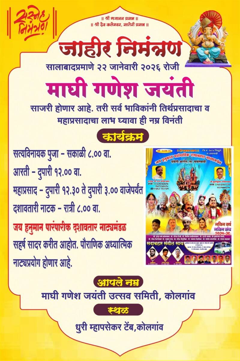 *ЁЯО┤рд╕рд╛рд╡рдВрддрд╡рд╛рдбреА, рджрд┐- резреп:-* рдХреЛрд▓рдЧрд╛рдВрд╡ рдпреЗрдереАрд▓ рдзреБрд░реА рдореНрд╣рд╛рдкрд╕реЗрдХрд░ рдЯреЗрдВрдм рдпреЗрдереЗ рджрд░рд╡рд░реНрд╖реАрдкреНрд░рдорд╛рдгреЗ рдпрд╛рд╡рд░реНрд╖реАрд╣реА реиреи рдЬрд╛рдиреЗрд╡рд╛рд░реА реирежреирем рд░реЛрдЬреА ‘рдорд╛рдШреА рдЧрдгреЗрд╢ рдЬрдпрдВрддреА’ рдЙрддреНрд╕рд╡ рдореЛрдареНрдпрд╛ рдЙрддреНрд╕рд╛рд╣рд╛рдд рд╕рд╛рдЬрд░рд╛ рдХрд░рдгреНрдпрд╛рдд рдпреЗрдгрд╛рд░ рдЖрд╣реЗ. рдорд╛рдШреА рдЧрдгреЗрд╢ рдЬрдпрдВрддреА рдЙрддреНрд╕рд╡ рд╕рдорд┐рддреА, рдХреЛрд▓рдЧрд╛рд╡ рдпрд╛рдВрдЪреНрдпрд╛ рд╡рддреАрдиреЗ рдпрд╛ рдзрд╛рд░реНрдорд┐рдХ рдЖрдгрд┐ рд╕рд╛рдВрд╕реНрдХреГрддрд┐рдХ рдХрд╛рд░реНрдпрдХреНрд░рдорд╛рдЪреЗ рдирд┐рдпреЛрдЬрди рдХрд░рдгреНрдпрд╛рдд рдЖрд▓реЗ рдЖрд╣реЗ.