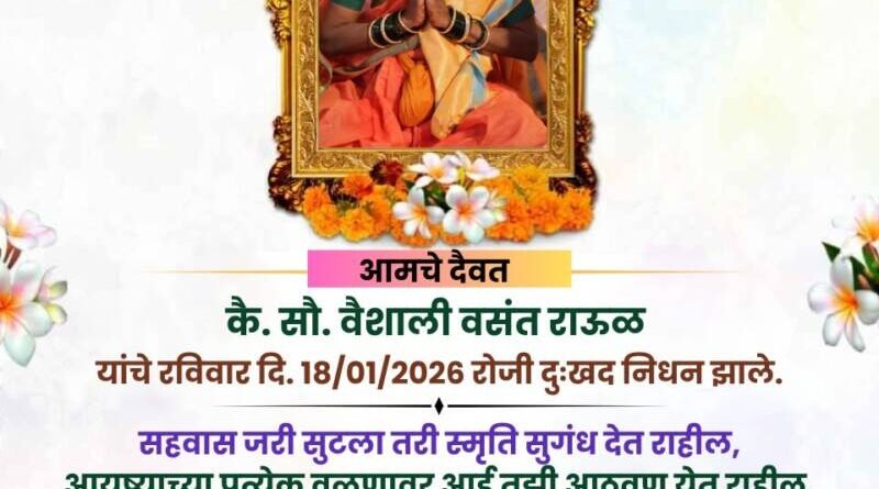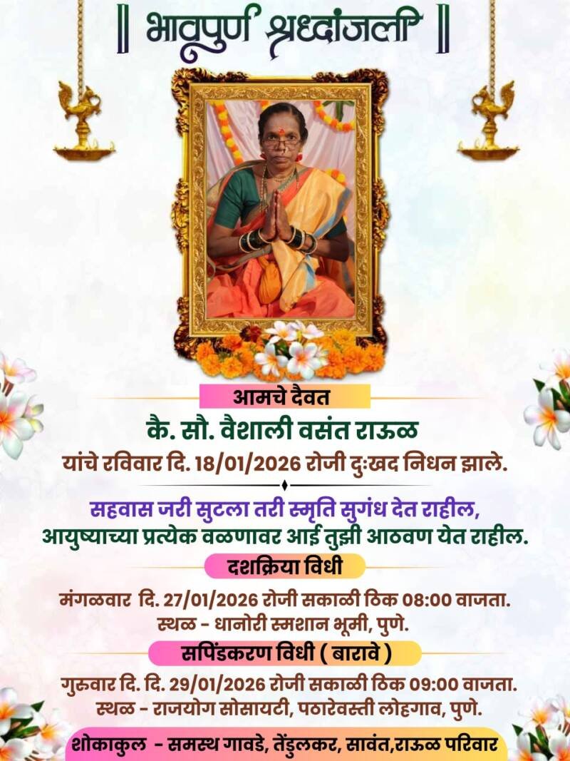 *ЁЯО┤рд╕рд╛рд╡рдВрддрд╡рд╛рдбреА, рджрд┐- реирей:-* рд╕рд╛рдВрдЧреЗрд▓реА рдпреЗрдереАрд▓ рд╕реМ рд╡реИрд╢рд╛рд▓реА рд╡рд╕рдВрдд рд░рд╛рдКрд│ рдпрд╛рдВрдЪреЗ 18 рдЬрд╛рдиреЗрд╡рд╛рд░реА рд░реЛрдЬреА рдореБрдВрдмрдИ рдпреЗрдереЗ рдИрд╕реНрдкреАрддрд│рд╛рдд рдЙрдкрдЪрд╛рд░ рдШреЗрдд рдЕрд╕рддрд╛рдирд╛ рдирд┐рдзрди рдЭрд╛рд▓реЗ. рднрд╛рд░рддреАрдп рдЬрдирддрд╛ рдкрд╛рд░реНрдЯреАрдЪреЗ рдорд╛рдЬреА рдпреБрд╡рд╛ рдореЛрд░реНрдЪрд╛ рдЕрдзреНрдпрдХреНрд╖ рд╡реИрднрд╡ рд░рд╛рдКрд│ рдпрд╛рдВрдЪреНрдпрд╛ рддреНрдпрд╛ рдорд╛рддреЛрд╢реНрд░реА рд╣реЛрдд. рддреНрдпрд╛рдВрдЪреНрдпрд╛ рдкрд╛рдареАрдорд╛рдЧреЗ рддреНрдпрд╛рдВрдЪреЗ рдкрддреА рд╡рд╕рдВрдд рд░рд╛рдКрд│ рддреАрди рдореБрд▓рдЧреЗ ,рд╕реБрдирд╛, рдирд╛рддрд╡рдВрдбреЗ рдЕрд╕рд╛ рдкрд░рд┐рд╡рд╛рд░ рдЖрд╣реЗ рд╕реМ рд╡реИрд╢рд╛рд▓реА рд░рд╛рдКрд│ рдпрд╛рдВрдЪрд╛ рджрд╢рдХреНрд░рд┐рдпрд╛ рд╡рд┐рдзреА рдордВрдЧрд│рд╡рд╛рд░ рджрд┐рдирд╛рдВрдХ 27 рдЬрд╛рдиреЗрд╡рд╛рд░реА 2026 рд░реЛрдЬреА рдкреБрдгреЗ рдпреЗрдереЗ рддреНрдпрд╛рдВрдЪреНрдпрд╛ рд░рд╛рдЬрдпреЛрдЧ рд╕реЛрд╕рд╛рдпрдЯреА рдкрд╛рдард╛рд░реЗ рд╡рд╕реНрддреА рд▓реЛрд╣рдЧрд╛рд╡ рдпрд╛ рдард┐рдХрд╛рдгреА рд╣реЛрдгрд╛рд░ рдЖрд╣реЗ.