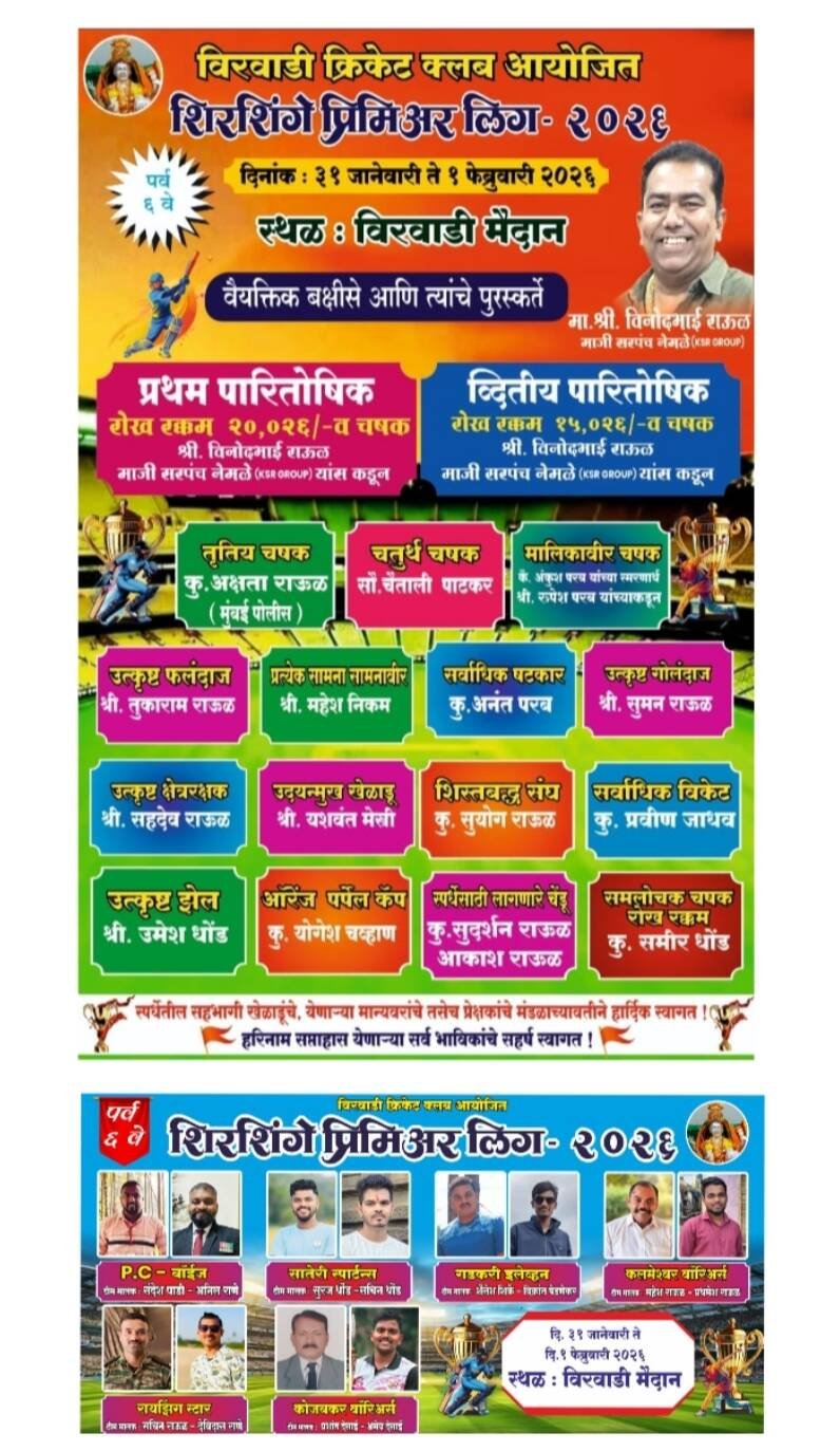 *ЁЯО┤рд╢рд┐рд░рд╢рд┐рдВрдЧреЗ, рджрд┐- рейреж:-* рд╡рд┐рд░рд╡рд╛рдбреА рдХреНрд░рд┐рдХреЗрдЯ рдХреНрд▓рдм рдпрд╛рдВрдЪреНрдпрд╛ рд╡рддреАрдиреЗ рдЖрдпреЛрдЬрд┐рдд рд╢рд┐рд░рд╢рд┐рдВрдЧреЗ рдкреНрд░реАрдорд┐рдЕрд░ рд▓реАрдЧ реирежреирем рдпрд╛ рдХреНрд░рд┐рдХреЗрдЯ рд╕реНрдкрд░реНрдзреЗрдЪреЗ рд╕рд╣рд╛рд╡реЗ рдкрд░реНрд╡ рдпреЗрддреНрдпрд╛ рейрез рдЬрд╛рдиреЗрд╡рд╛рд░реА рддреЗ рез рдлреЗрдмреНрд░реБрд╡рд╛рд░реА реирежреирем рджрд░рдореНрдпрд╛рди рд╡рд┐рд░рд╡рд╛рдбреА рдпреЗрдереАрд▓ рднрд╡реНрдп рдореИрджрд╛рдирд╛рд╡рд░ рдЙрддреНрд╕рд╛рд╣рд╛рдд рдкрд╛рд░ рдкрдбрдгрд╛рд░ рдЖрд╣реЗ.