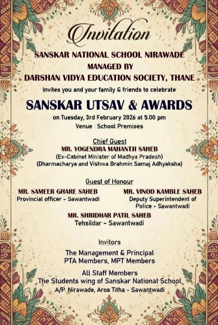 *ЁЯО┤рд╕рд╛рд╡рдВрддрд╡рд╛рдбреА, рджрд┐- режрей:-* рджрд░реНрд╢рди рд╡рд┐рджреНрдпрд╛ рдПрдЬреНрдпреБрдХреЗрд╢рди рд╕реЛрд╕рд╛рдпрдЯреА, рдард╛рдгреЗрдЪреЗ рд╕рдВрд╕реНрдХрд╛рд░ рдиреЕрд╢рдирд▓ рд╕реНрдХреВрд▓ рдирд┐рд░рд╡рдбреЗрдЪреЗ рд╕реНрдиреЗрд╣рдирд╕рдВрдореЗрд▓рди рдЖрдгрд┐ рдмрдХреНрд╖реАрд╕ рд╡рд┐рддрд░рдг рд╕реЛрд╣рд│рд╛ рдордВрдЧрд│рд╡рд╛рд░, рджрд┐. 3 рдлреЗрдмреНрд░реБрд╡рд╛рд░реА рд░реЛрдЬреА рдЖрдпреЛрдЬрд┐рдд рдХрд░рдгреНрдпрд╛рдд рдЖрд▓реЗ рдЖрд╣реЗ. рд╕рд╛рдпрдВрдХрд╛рд│реА 5 рд╡рд╛. рд╢рд╛рд│рд╛ рдкреНрд░рд╛рдВрдЧрдгрд╛рдд рдЙрджреНрдШрд╛рдЯрди рд╕реЛрд╣рд│рд╛ рд╣реЛрдгрд╛рд░ рдЖрд╣реЗ. рдЙрджреНрдШрд╛рдЯрди рдХрд╛рд░реНрдпрдХреНрд░рдорд╛рд╕ рдордзреНрдпрдкреНрд░рджреЗрд╢рдЪреЗ рдорд╛рдЬреА рдХреЕрдмрд┐рдиреЗрдЯ рдордВрддреНрд░реА рдзрд░реНрдорд╛рдЪрд╛рд░реНрдп рдЖрдгрд┐ рд╡рд┐рд╢реНрд╡ рдмреНрд░рд╛рд╣реНрдордг рд╕рдорд╛рдЬрд╛рдЪреЗ рдЕрдзреНрдпрдХреНрд╖ рдпреЛрдЧреЗрдВрджреНрд░ рдорд╣рдВрддрдЬреА рдореБрдЦреНрдп рдЕрддрд┐рдереА рдореНрд╣рдгреВрди рдЙрдкрд╕реНрдерд┐рдд рд░рд╛рд╣рдгрд╛рд░ рдЖрд╣реЗрдд. рдкреНрд░рд╛рдВрдд рдЕрдзрд┐рдХрд╛рд░реА рд╕рдореАрд░ рдШрд╛рд░реЗ, рдЙрдкрд╡рд┐рднрд╛рдЧреАрдп рдкреЛрд▓рд┐рд╕ рдЕрдзрд┐рдХрд╛рд░реА рд╡рд┐рдиреЛрдж рдХрд╛рдВрдмрд│реЗ, рддрд╣рд╕рд┐рд▓рджрд╛рд░ рд╢реНрд░реАрдзрд░ рдкрд╛рдЯреАрд▓ рдЖрджреА рдорд╛рдиреНрдпрд╡рд░ рдЙрдкрд╕реНрдерд┐рдд рд░рд╛рд╣рдгрд╛рд░ рдЖрд╣реЗрдд. рд╕реНрдиреЗрд╣рд╕рдВрдореЗрд▓рди рдЖрдгрд┐ рдмрдХреНрд╖реАрд╕ рд╡рд┐рддрд░рдг рдХрд╛рд░реНрдпрдХреНрд░рдорд╛рд╕ рдЙрдкрд╕реНрдерд┐рдд рд░рд╛рд╣рдгреНрдпрд╛рдЪреЗ рдЖрд╡рд╛рд╣рди рд╢рд╛рд│рд╛ рд╡реНрдпрд╡рд╕реНрдерд╛рдкрди рд╕рдорд┐рддреА, рдкрд╛рд▓рдХ-рд╢рд┐рдХреНрд╖рдХ рд╕рдорд┐рддреА рдЖрдгрд┐ рдореБрдЦреНрдпрд╛рдзреНрдпрд╛рдкрдХ рдкреНрд░рдгрд╛рд▓реА рд░реЗрдбрдХрд░ рдпрд╛рдВрдиреА рдХреЗрд▓реЗ рдЖрд╣реЗ.