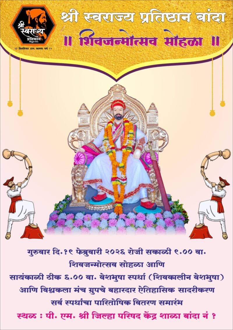 ЁЯЫСрдмрд╛рдВрджрд╛ рдпреЗрдереАрд▓ рд╢реНрд░реА рд╕реНрд╡рд░рд╛рдЬреНрдп рдкреНрд░рддрд┐рд╖реНрдард╛рдирдЪреНрдпрд╛ рд╡рддреАрдиреЗ рдЧреБрд░реБрд╡рд╛рд░ рджрд┐.резреп рдлреЗрдмреНрд░реБрд╡рд╛рд░реА рд░реЛрдЬреА рд╢рд┐рд╡рдЬрдиреНрдореЛрддреНрд╕рд╡ рд╕реЛрд╣рд│реНрдпрд╛рдЪреЗ рдЖрдпреЛрдЬрди.