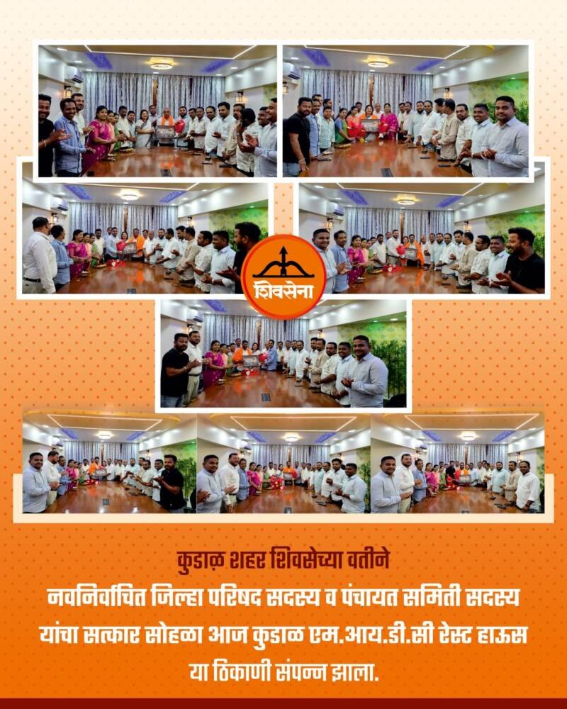 рд╣реНрдпрд╛ рдордзреНрдпреЗ рдЖрдВрдмрдб рдЬрд┐рд▓реНрд╣рд╛ рдкрд░рд┐рд╖рдж, рдкрд╛рд╡рд╢реА рдЬрд┐.рдк рд╕рджрд╕реНрдп, рд╡реЗрддрд╛рд│ рдмрд╛рдВрдмрд░реНрдбреЗ рдЬрд┐ рдк рд╕рджрд╕реНрдп, рдШрд╛рд╡рдирд│реЗ рдЬрд┐ рдк рд╕рджрд╕реНрдп, рдорд╛рдгрдЧрд╛рд╡ рдЬрд┐. рдк рдЗрддреНрдпрд╛рджреА рдирд╡рдирд┐рд░реНрд╡рд╛рдЪрд┐рдд рдЬрд┐рд▓реНрд╣рд╛ рдкрд░рд┐рд╖рдж рд╕рджрд╕реНрдп рдпрд╛рдВрдЪрд╛ рд╕рддреНрдХрд╛рд░ рд╕реЛрд╣рд│рд╛ рдХреБрдбрд╛рд│ рд╢рд╣рд░ рд╢рд┐рд╡рд╕реЗрдиреЗрдЪреНрдпрд╛ рд╡рддреАрдиреЗ рдЖрдпреЛрдЬрд┐рдд рдХрд░рдгреНрдпрд╛рдд рдЖрд▓рд╛ рд╣реЛрддрд╛. рд╣реНрдпрд╛ рдордзреНрдпреЗ рд╢рд┐рд╡рд╕реЗрдирд╛ рдорд╣рд┐рд▓рд╛ рдЬрд┐рд▓реНрд╣рд╛рдкреНрд░рдореБрдЦ рд╕реМ.рджрд┐рдкрд▓рдХреНрд╖реНрдореА рдкрдбрддреЗ, рд╢реНрд░реА рджрд╛рджрд╛ рд╕рд╛рдИрд▓,рд╢реНрд░реА рдирд╛рдЧреЗрд╢ рдЖрдИрд░, рдЬрд┐рд▓реНрд╣рд╛ рдкрд░рд┐рд╖рджреЗрдЪреЗ рдЧрдЯрдиреЗрддреЗ рджреАрдкрдХ рдирд╛рд░рдХрд░, рд╢реНрд░реА рд░реБрдкреЗрд╢ рдХрд╛рдирдбреЗ рд╣реНрдпрд╛ рдирд╡рдирд┐рд░реНрд╡рд╛рдЪрд┐рдд рдЬрд┐рд▓реНрд╣рд╛ рдкрд░рд┐рд╖рдж рд╕рджрд╕реНрдпрд╛рдВрдЪрд╛ рд╕рддреНрдХрд╛рд░ рд╕рдорд╛рд░рдВрдн рд╕рдВрдкрдиреНрди рдЭрд╛рд▓рд╛ рддрд╕реЗрдЪ рдХреБрдбрд╛рд│ рдкрдВрдЪрд╛рдпрдд рд╕рдорд┐рддреА рд╢рд┐рд╡рд╕реЗрдиреЗрдЪреЗ рд╕рджрд╕реНрдп рд╢реНрд░реА рдирд┐рдЦрд┐рд▓ рдХрд╛рдВрджрд│рдЧрд╛рд╡рдХрд░, рд╢реНрд░реА рдорд┐рд▓рд┐рдВрдж рдирд╛рдИрдХ, рдЧреЛрдЯреЛрд╕ рдкрдВрдЪрд╛рдпрдд рд╕рдорд┐рддреАрдЪреЗ рд╕рджрд╕реНрдп рд╡ рдЕрдиреНрдп рд╕рджрд╕реНрдпрд╛рдВрдЪреЗ рд╕рддреНрдХрд╛рд░ рдХреБрдбрд╛рд│ рд╢рд╣рд░ рд╢рд┐рд╡рд╕реЗрдиреЗрдЪреНрдпрд╛ рд╡рддреАрдиреЗ рдХрд░рдгреНрдпрд╛рдд рдЖрд▓реЗ. рддреНрдпрд╛рд╡реЗрд│реА рдЙрдкрд╕реНрдерд┐рдд рдХреБрдбрд╛рд│ рд╢рд╣рд░рд╛рдЪреЗ рдорд╛рдЬреА рдирдЧрд░рд╛рдзреНрдпрдХреНрд╖ рдУрдВрдХрд╛рд░ рддреЗрд▓реА, рдХреБрдбрд╛рд│ рд╢рд╣рд░ рд╢рд┐рд╡рд╕реЗрдирд╛ рд╢рд╣рд░рдкреНрд░рдореБрдЦ рддрдерд╛ рдирдЧрд░рд╕реЗрд╡рдХ рдЕрднрд┐рд╖реЗрдХ рдЧрд╛рд╡рдбреЗ,рдЧрдЯрдиреЗрддреЗ рдирдЧрд░рдкрдВрдЪрд╛рдпрдд рддрдерд╛ рдирдЧрд░рд╕реЗрд╡рдХ рд╡рд┐рд▓рд╛рд╕ рдХреБрдбрд╛рд│рдХрд░, рдЖрдбрд╡реЛрдХреЗрдЯ рдирдЧрд░рд╕реЗрд╡рдХ рд░рд╛рдЬреАрд╡ рдХреБрдбрд╛рд│рдХрд░,рдорд╣рд┐рд▓рд╛ рд╢рд╣рд░ рдкреНрд░рдореБрдЦ рдирдЧрд░рд╕реЗрд╡рд┐рдХрд╛ рд╕реМ рд╢реНрд░реБрддреА рд╡рд░реНрджрдо, рдорд╛рдЬреА рдЙрдкрдирдЧрд░рд╛рдзреНрдпрдХреНрд╖ рдЖрдмрд╛ рдзрдбрд╛рдо, рдорд╛рдЬреА рдирдЧрд░рд╕реЗрд╡рдХ рд░рд╛рдХреЗрд╢ рдХрд╛рдВрджреЗ, рдЙрдкрд╢рд╣рд░ рдкреНрд░рдореБрдЦ рдЪреЗрддрди рдкрдбрддреЗ, рдорд╛рдЬреА рдирдЧрд░рд╕реЗрд╡рд┐рдХрд╛ рд╕реМ рд╕рд╛рдХреНрд╖реА рд╕рд╛рд╡рдВрдд, рд╕реМ.рд░реЗрдЦрд╛ рдХрд╛рдгреЗрдХрд░, рдХреБрдбрд╛рд│ рд╢рд╣рд░ рд╢рд╛рдЦрд╛рдкреНрд░рдореБрдЦ рдпреЛрдЧреЗрд╢ рдХрд╛рд│рдк, рдкреНрд░рдердореЗрд╢ рдХрд╛рдВрдмрд│реЗ, рд╕реЛрд╢рд▓ рдореАрдбрд┐рдпрд╛рдЪреЗ рд░рд╛рдЬрд╡реАрд░ рдкрд╛рдЯреАрд▓, рдЪрдВрджрди рдХрд╛рдВрдмрд│реА рдЖрджреА рд╢рд╣рд░рд╛рддреАрд▓ рдкрджрд╛рдзрд┐рдХрд╛рд░реА рд╡ рд▓реЛрдХрдкреНрд░рддрд┐рдирд┐рдзреА рд╢рд┐рд╡рд╕реИрдирд┐рдХ рдореЛрдареНрдпрд╛ рдк