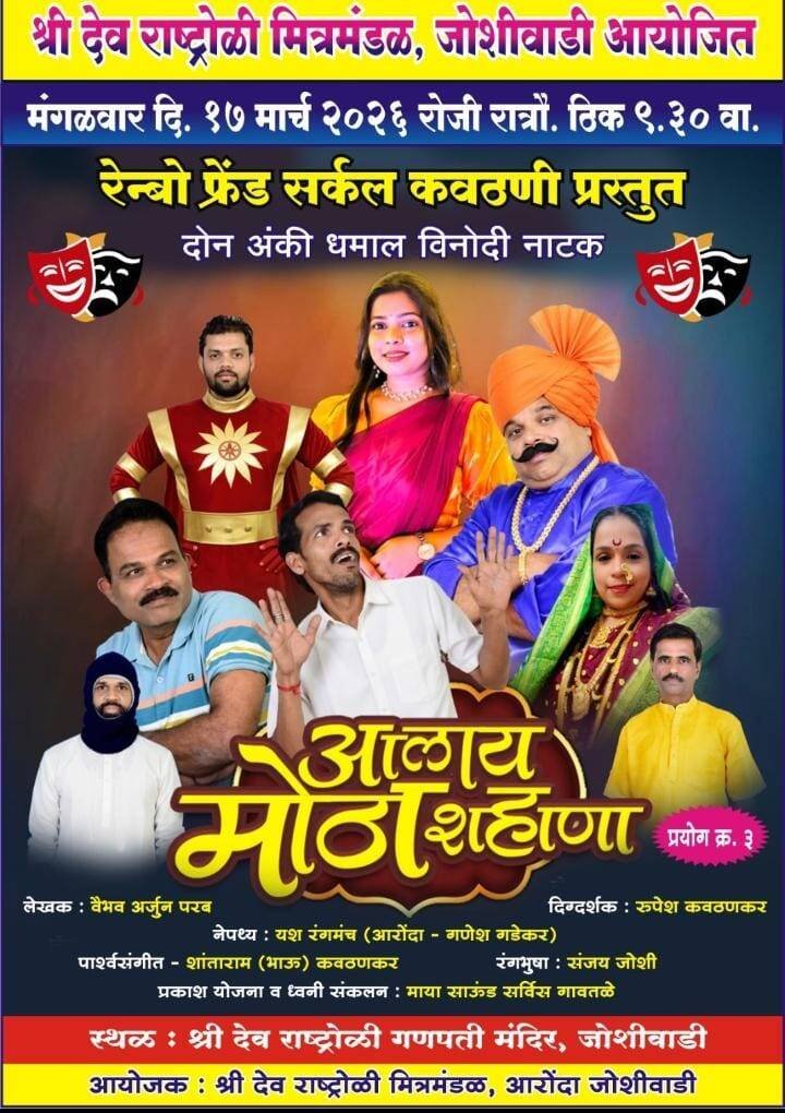 *ЁЯО┤рд╕рд╛рд╡рдВрддрд╡рд╛рдбреА, рджрд┐- резрей:-* рдЖрд░реЛрдВрджрд╛ рдпреЗрдереЗ рдордВрдЧрд│рд╡рд╛рд░ резрен рдорд╛рд░реНрдЪ рд░реЛрдЬреА рд░рд╛рддреНрд░реМ реп:рейреж рд╡рд╛.рд╢реНрд░реА рджреЗрд╡ рд░рд╛рд╖реНрдЯреНрд░реЛрд│реА рдорд┐рддреНрд░рдордВрдбрд│ рдЬреЛрд╢реАрд╡рд╛рдбреА рдЖрдпреЛрдЬрд┐рдд, рд░реЗрдиреНрдмреЛ рдлреНрд░реЗрдВрдб рд╕рд░реНрдХрд▓ рдХрд╡рдардгреА рдкреНрд░рд╕реНрддреБрдд рджреЛрди рдЕрдВрдХреА рдзрдорд╛рд▓ рд╡рд┐рдиреЛрджреА рдирд╛рдЯрдХ “рдЖрд▓рд╛рдп рдореЛрдард╛ рд╢рд╣рд╛рдгрд╛” рдЪреЗ рдЖрдпреЛрдЬрди рдХрд░рдгреНрдпрд╛рдд рдЖрд▓реЗ рдЖрд╣реЗ.