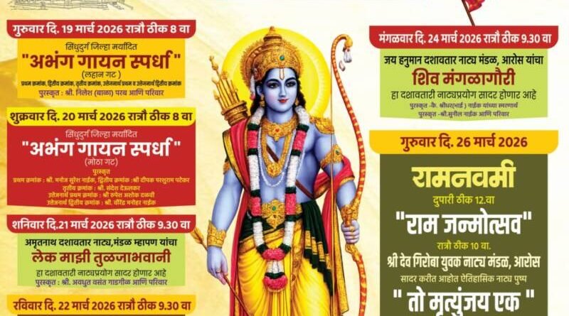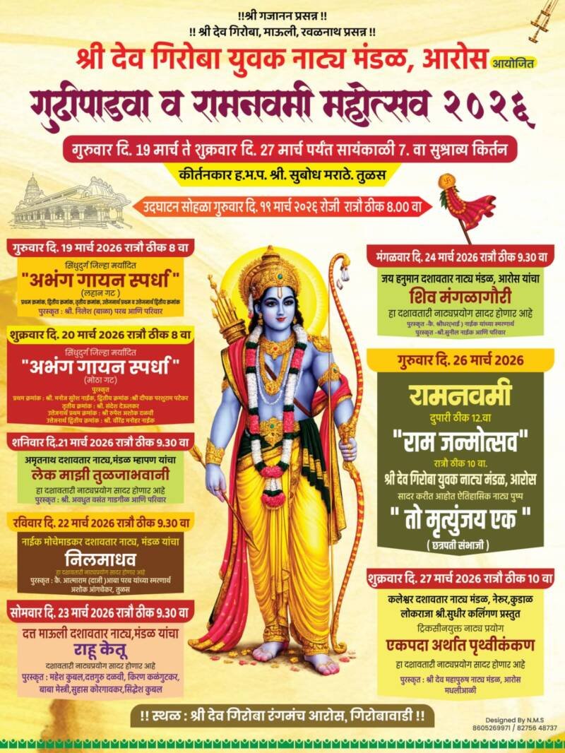 рдпрд╛ рдХрд╛рд░реНрдпрдХреНрд░рдорд╛рдирдВрддрд░ рд╕рд┐рдВрдзреБрджреБрд░реНрдЧ рдЬрд┐рд▓реНрд╣рд╛ рдорд░реНрдпрд╛рджрд┐рдд рд▓рд╣рд╛рди рдЧрдЯрд╛рдЪреА рдЕрднрдВрдЧ рдЧрд╛рдпрди рд╕реНрдкрд░реНрдзрд╛ рд╣реЛрдгрд╛рд░ рдЖрд╣реЗ. рд╢реБрдХреНрд░рд╡рд╛рд░, рджрд┐. 20 рд░реЛрдЬреА рд░рд╛рддреНрд░реА 8 рд╡рд╛. рдореЛрдареНрдпрд╛ рдЧрдЯрд╛рдЪреА рдЕрднрдВрдЧ рдЧрд╛рдпрди рд╕реНрдкрд░реНрдзрд╛ рд╣реЛрдгрд╛рд░ рдЖрд╣реЗ. рд╢рдирд┐рд╡рд╛рд░ рджрд┐. 21 рд░реЛрдЬреА рд░рд╛рддреНрд░реА 9.30 рд╡рд╛рдЬрддрд╛ рдЕрдореГрддрдирд╛рде рджрд╢рд╛рд╡рддрд╛рд░ рдирд╛рдЯреНрдпрдордВрдбрд│, рдореНрд╣рд╛рдкрдг рдпрд╛рдВрдЪрд╛ ‘рд▓реЗрдХ рдорд╛рдЭреА рддреБрд│рдЬрд╛рднрд╡рд╛рдиреА’ рд╣рд╛ рджрд╢рд╛рд╡рддрд╛рд░реА рдирд╛рдЯреНрдп рдкреНрд░рдпреЛрдЧ рд╣реЛрдгрд╛рд░ рдЖрд╣реЗ. рд░рд╡рд┐рд╡рд╛рд░ рджрд┐. 22 рд░реЛрдЬреА рд░рд╛рддреНрд░реА 9.30 рд╡рд╛рдЬрддрд╛ рдирд╛рдИрдХ рдореЛрдЪреЗрдорд╛рдбрдХрд░ рджрд╢рд╛рд╡рддрд╛рд░ рдирд╛рдЯреНрдп рдордВрдбрд│ рдпрд╛рдВрдЪрд╛ ‘рдиреАрд▓ рдорд╛рдзрд╡’ рд╣рд╛ рджрд╢рд╛рд╡рддрд╛рд░ рдирд╛рдЯреНрдпрдкреНрд░рдпреЛрдЧ рд╣реЛрдгрд╛рд░ рдЖрд╣реЗ. рд╕реЛрдорд╡рд╛рд░ рджрд┐. 23 рд░реЛрдЬреА рджрддреНрдд рдорд╛рдКрд▓реА рджрд╢рд╛рд╡рддрд╛рд░ рдирд╛рдЯреНрдпрдордВрдбрд│ рдпрд╛рдВрдЪрд╛ ‘рд░рд╛рд╣реВ рдХреЗрддреВ’ рд╣рд╛ рдирд╛рдЯреНрдпрдкреНрд░рдпреЛрдЧ рд╣реЛрдгрд╛рд░ рдЖрд╣реЗ. рдордВрдЧрд│рд╡рд╛рд░, рджрд┐. 24 рдорд╛рд░реНрдЪ рд░реЛрдЬреА рд░рд╛рддреНрд░реА 9.30 рд╡рд╛рдЬрддрд╛ ‘рд╢рд┐рд╡рдордВрдЧрд│рд╛рдЧреМрд░реА’ рд╣рд╛ рджрд╢рд╛рд╡рддрд╛рд░реА рдирд╛рдЯреНрдпрдкреНрд░рдпреЛрдЧ рд╣реЛрдгрд╛рд░ рдЖрд╣реЗ. рдЧреБрд░реБрд╡рд╛рд░ рджрд┐. 26 рдорд╛рд░реНрдЪ рд░реЛрдЬреА рджреБрдкрд╛рд░реА 12 рд╡рд╛рдЬрддрд╛ рд░рд╛рдордирд╡рдореАрдирд┐рдорд┐рддреНрдд рд░рд╛рдо рдЬрдиреНрдореЛрддреНрд╕рд╡рд╛рдЪрд╛ рдХрд╛рд░реНрдпрдХреНрд░рдо рд╣реЛрдгрд╛рд░ рдЖрд╣реЗ. рдпрд╛рдирд┐рдорд┐рддреНрдд рд░рд╛рддреНрд░реА 10 рд╡рд╛рдЬрддрд╛ рд╢реНрд░реА рджреЗрд╡ рдЧрд┐рд░реЛрдмрд╛ рдпреБрд╡рдХ рдирд╛рдЯреНрдпрдордВрдбрд│, рдЖрд░реЛрд╕ рдпрд╛рдВрдЪрд╛ рдРрддрд┐рд╣рд╛рд╕рд┐рдХ ‘рддреЛ рдореГрддреНрдпреБрдВрдЬрдп рдПрдХ’ рд╣рд╛ рдирд╛рдЯреНрдп рдкреНрд░рдпреЛрдЧ рд╣реЛрдгрд╛рд░ рдЖрд╣реЗ. рд╢реБрдХреНрд░рд╡рд╛рд░, рджрд┐. 27 рдорд╛рд░реНрдЪ рд░реЛрдЬреА рд░рд╛рддреНрд░реА 10 рд╡рд╛рдЬрддрд╛ рдХрд▓реЗрд╢реНрд╡рд░ рджрд╢рд╛рд╡рддрд╛рд░ рдирд╛рдЯреНрдп рдордВрдбрд│ рдиреЗрд░реБрд│ рдпрд╛рдВрдЪрд╛ рд▓реЛрдХрд░рд╛рдЬрд╛ рд╕реБрдзреАрд░ рдХрд▓рд┐рдВрдЧрдг рдкреНрд░рд╕реНрддреБрдд рдЯреНрд░рд┐рдХрд╕рд┐рдирдпреБрдХреНрдд ‘рдПрдХ рдкрджрд╛ рдЕрд░реНрдерд╛рдд рдкреГрдереНрд╡реА рдХрдВрдХрдг’ рд╣рд╛ рджрд╢рд╛рд╡рддрд╛рд░реА рдирд╛рдЯреНрдпрдкреНрд░рдпреЛрдЧ рд╣реЛрдгрд╛рд░ рдЖрд╣реЗ. рд╣реЗ рд╕рд░реНрд╡ рд╕рд╛рдВрд╕реНрдХреГрддрд┐рдХ рдХрд╛рд░реНрдпрдХреНрд░рдо рд╢реНрд░реА рджреЗрд╡ рдЧрд┐рд░реЛрдмрд╛ рдордВрдЪ рдЖрд░реЛрд╕ рдЧрд┐рд░реЛрдмрд╛рд╡рд╛рдбреА рдпреЗрдереЗ рд╣реЛрдгрд╛рд░ рдЖрд╣реЗрдд.
