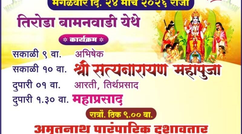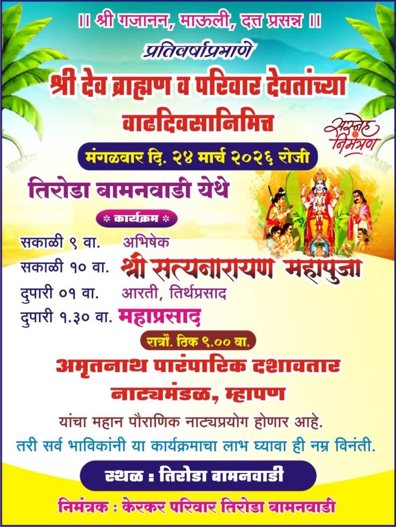 рд╕рдХрд╛рд│реА реп рд╡рд╛рдЬрддрд╛ рдЕрднрд┐рд╖реЗрдХ рд╕рдХрд╛рд│реА резреж рд╡рд╛рдЬрддрд╛ рд╢реНрд░реА рд╕рддреНрдпрдирд╛рд░рд╛рдпрдг рдорд╣рд╛рдкреВрдЬрд╛ ,рджреБрдкрд╛рд░реА рез рд╡рд╛рдЬрддрд╛ рдЖрд░рддреА, рддреАрд░реНрдердкреНрд░рд╕рд╛рдж ,рджреБрдкрд╛рд░реА рез:рейреж рд╡рд╛рдЬрддрд╛ рдорд╣рд╛рдкреНрд░рд╕рд╛рдж рддрд╕реЗрдЪ рд░рд╛рддреНрд░реМ рдареАрдХ реп рд╡рд╛рдЬрддрд╛ “рдЕрдореГрддрдирд╛рде рдкрд╛рд░рдВрдкрд╛рд░рд┐рдХ рджрд╢рд╛рд╡рддрд╛рд░ рдирд╛рдЯреНрдп рдордВрдбрд│ рдореНрд╣рд╛рдкрдг ” рдпрд╛рдВрдЪрд╛ рдорд╣рд╛рди рдкреМрд░рд╛рдгрд┐рдХ рдирд╛рдЯреНрдпрдкреНрд░рдпреЛрдЧ рд╣реЛрдгрд╛рд░ рдЖрд╣реЗ .рддрд░реА рд╕рд░реНрд╡ рднрд╛рд╡рд┐рдХрд╛рдВрдиреА рдпрд╛ рдХрд╛рд░реНрдпрдХреНрд░рдорд╛рдЪрд╛ рд▓рд╛рдн рдШреЗрдгреНрдпрд╛рдЪреЗ рдЖрд╡рд╛рд╣рди рдХреЗрд░рдХрд░ рдкрд░рд┐рд╡рд╛рд░ рддрд┐рд░реЛрдбрд╛ рдмрд╛рдордирд╡рд╛рдбреА рдпрд╛рдВрдиреА рдХреЗрд▓реЗ рдЖрд╣реЗ.