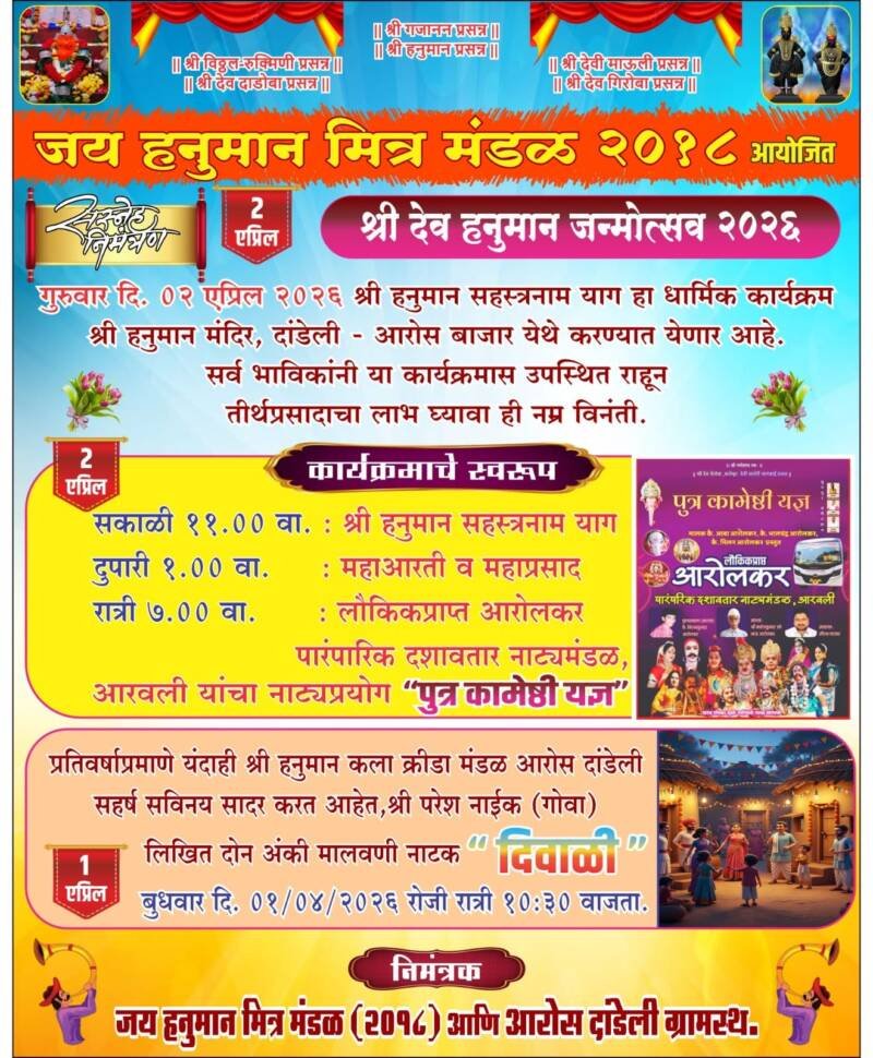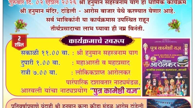 ЁЯО┤рд╕рд╛рд╡рдВрддрд╡рд╛рдбреА, рджрд┐-рейреж:– рдЬрдп рд╣рдиреБрдорд╛рди рдорд┐рддреНрд░ рдордВрдбрд│ реирежрезрео рдЖрдпреЛрдЬрд┐рдд рд╢реНрд░реА рджреЗрд╡ рд╣рдиреБрдорд╛рди рдЬрдиреНрдореЛрддреНрд╕рд╡ рдирд┐рдорд┐рддреНрдд рдЧреБрд░реБрд╡рд╛рд░ рджрд┐рдирд╛рдВрдХ реи рдПрдкреНрд░рд┐рд▓ рд░реЛрдЬреА рд╢реНрд░реА рд╣рдиреБрдорд╛рди рдордВрджрд┐рд░ рджрд╛рдВрдбреЗрд▓реА рдЖрд░реЛрд╕ рдмрд╛рдЬрд╛рд░ рдордВрджрд┐рд░рд╛рдд рд╢реНрд░реА рд╣рдиреБрдорд╛рди рд╕рд╣рд╕реНрд░рдирд╛рдо рдпрд╛рдХ рдЖрдзрд╛рд░рд┐рдд рдХрд╛рд░реНрдпрдХреНрд░рдо рдХрд░рдгреНрдпрд╛рдд рдпреЗрдгрд╛рд░ рдЖрд╣реЗ рддрд╕реЗрдЪ рд╕рдХрд╛рд│реА резрез рд╡рд╛рдЬрддрд╛ рд╢реНрд░реА рд╣рдиреБрдорд╛рди рд╕рд╣рд╕реНрд░рдирд╛рдо рдпрд╛рдЧ ,рджреБрдкрд╛рд░реА рез рд╡рд╛рдЬрддрд╛ рдорд╣рд╛рдЖрд░рддреА рд╡ рдорд╣рд╛рдкреНрд░рд╕рд╛рдж рддрд╕реЗрдЪ рд░рд╛рддреНрд░реМ рен рд╡рд╛рдЬрддрд╛ рд▓реМрдХрд┐рдХ рдкреНрд░рд╛рдкреНрдд рдЖрд░реЛрд▓рдХрд░ рдкрд╛рд░рдВрдкрд╛рд░рд┐рдХ рджрд╢рд╛рд╡рддрд╛рд░ рдирд╛рдЯреНрдп рдордВрдбрд│ рдЖрд░рд╡рд▓реА рдпрд╛рдВрдЪрд╛ “рдкреБрддреНрд░ рдХрд╛рдореЗрд╖реНрдареА рдпрдЬреНрдЮ “рд╣рд╛ рдирд╛рдЯреНрдп рдкреНрд░рдпреЛрдЧ .