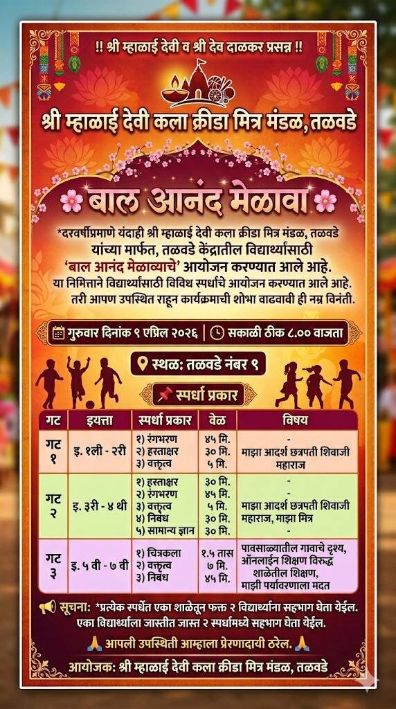 рд╣рд╛ рдореЗрд│рд╛рд╡рд╛ рдЧреБрд░реБрд╡рд╛рд░, рджрд┐рдирд╛рдВрдХ реп рдПрдкреНрд░рд┐рд▓ реирежреирем рд░реЛрдЬреА рд╕рдХрд╛рд│реА рео рд╡рд╛рдЬрддрд╛ рддрд│рд╡рдбреЗ рдирдВрдмрд░ рез рдпреЗрдереЗ рдЖрдпреЛрдЬрд┐рдд рдХрд░рдгреНрдпрд╛рдд рдЖрд▓рд╛ рдЖрд╣реЗ. рдпрд╛ рдореЗрд│рд╛рд╡реНрдпрд╛рдд рдЗрдпрддреНрддрд╛ рез рд▓реА рддреЗ рен рд╡реАрдкрд░реНрдпрдВрддрдЪреНрдпрд╛ рд╡рд┐рджреНрдпрд╛рд░реНрдереНрдпрд╛рдВрд╕рд╛рдареА рд╡реЗрдЧрд╡реЗрдЧрд│реНрдпрд╛ рдЧрдЯрд╛рдВрдордзреНрдпреЗ рд╕реНрдкрд░реНрдзрд╛рдВрдЪреЗ рдЖрдпреЛрдЬрди рдХрд░рдгреНрдпрд╛рдд рдЖрд▓реЗ рдЖрд╣реЗ. рд▓рд╣рд╛рди рдЧрдЯрд╛рддреАрд▓ рд╡рд┐рджреНрдпрд╛рд░реНрдереНрдпрд╛рдВрд╕рд╛рдареА рд░рдВрдЧрднрд░рдг, рд╣рд╕реНрддрд╛рдХреНрд╖рд░ рдЖрдгрд┐ рд╡рдХреНрддреГрддреНрд╡ рд╕реНрдкрд░реНрдзрд╛ рдШреЗрдгреНрдпрд╛рдд рдпреЗрдгрд╛рд░ рдЖрд╣реЗрдд, рддрд░ рдореЛрдареНрдпрд╛ рдЧрдЯрд╛рддреАрд▓ рд╡рд┐рджреНрдпрд╛рд░реНрдереНрдпрд╛рдВрд╕рд╛рдареА рдирд┐рдмрдВрдз, рд╕рд╛рдорд╛рдиреНрдп рдЬреНрдЮрд╛рди, рдЪрд┐рддреНрд░рдХрд▓рд╛ рдЖрдгрд┐ рд╡рдХреНрддреГрддреНрд╡ рдЕрд╢рд╛ рд╕реНрдкрд░реНрдзрд╛рдВрдЪрд╛ рд╕рдорд╛рд╡реЗрд╢ рдЖрд╣реЗ.