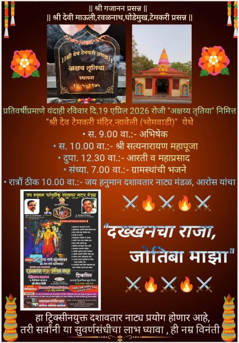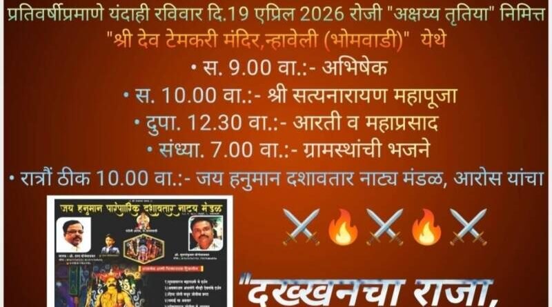 *ЁЯО┤рд╕рд╛рд╡рдВрддрд╡рд╛рдбреА, рджрд┐- резрен:-* рдиреНрд╣рд╛рд╡реЗрд▓реА (рднреЛрдорд╡рд╛рдбреА) рдпреЗрдереАрд▓ рд╢реНрд░реА рджреЗрд╡ рдЯреЗрдордХрд░реА рдордВрджрд┐рд░,рдпреЗрдереЗ “рдЕрдХреНрд╖рдпреНрдп рддреГрддрд┐рдпрд╛” рдирд┐рдорд┐рддреНрдд рд╡рд┐рд╡рд┐рдз рдзрд╛рд░реНрдорд┐рдХ рдХрд╛рд░реНрдпрдХреНрд░рдорд╛рдВрдЪреЗ рдЖрдпреЛрдЬрди рдХрд░рдгреНрдпрд╛рдд рдЖрд▓реЗ рдЕрд╕реВрди рд╕. реп рд╡рд╛.рдЕрднрд┐рд╖реЗрдХ , рд╕.резреж рд╡рд╛рдЬрддрд╛ “рд╢реНрд░реА рд╕рддреНрдпрдирд╛рд░рд╛рдпрдг рдорд╣рд╛рдкреВрдЬрд╛” ,рджреБ. резреи:рейреж рд╡рд╛. рдЖрд░рддреА рд╡ рдорд╣рд╛рдкреНрд░рд╕рд╛рдж,рд╕рдВрдзреНрдпрд╛. рен рд╡рд╛. рдЧреНрд░рд╛рдорд╕реНрдерд╛рдВрдЪреА рднрдЬрдиреЗ рддрд╕реЗрдЪ рд░рд╛рддреНрд░реМрдВ рдареАрдХ резреж рд╡рд╛. рдЬрдп рд╣рдиреБрдорд╛рди рджрд╢рд╛рд╡рддрд╛рд░ рдирд╛рдЯреНрдп рдордВрдбрд│, рдЖрд░реЛрд╕ рдпрд╛рдВрдЪрд╛ “рджрдЦреНрдЦрдирдЪрд╛ рд░рд╛рдЬрд╛, рдЬреЛрддрд┐рдмрд╛ рдорд╛рдЭрд╛” рд╣рд╛ рдЯреНрд░рд┐рдХреНрд╕реАрдирдпреБрдХреНрдд рджрд╢рд╛рд╡рддрд╛рд░ рдирд╛рдЯреНрдп рдкреНрд░рдпреЛрдЧ рд╣реЛрдгрд╛рд░ рдЖрд╣реЗ, рддрд░реА рд╕рд░реНрд╡рд╛рдВрдиреА рдпрд╛ рдХрд╛рд░реНрдпрдХреНрд░рдорд╛рдЪрд╛ рд▓рд╛рдн рдШреЗрдгреНрдпрд╛рдЪреЗ рдЖрд╡рд╛рд╣рди рдиреНрд╣рд╛рд╡реЗрд▓реА рдЧреНрд░рд╛рдорд╕реНрдерд╛рдВрдиреА рдХреЗрд▓реЗ рдЖрд╣реЗ.