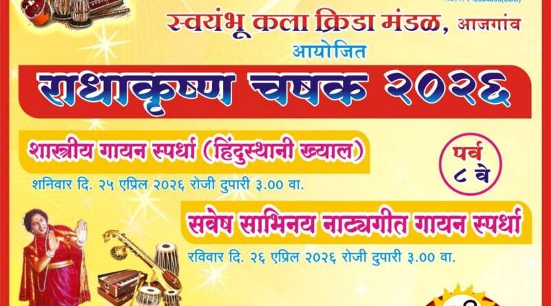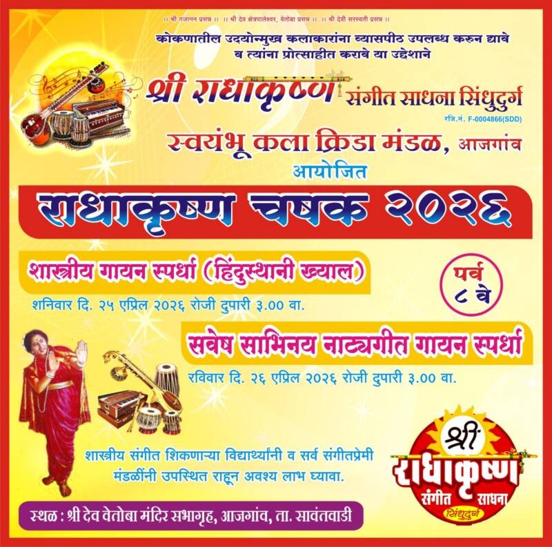*ЁЯО┤рд╕рд╛рд╡рдВрддрд╡рд╛рдбреА, рджрд┐- резрен:-* рдХреЛрдХрдгрд╛рддреАрд▓ рдЙрджреНрдпреЛрдиреНрдореБрдЦ рдХрд▓рд╛рдХрд╛рд░рд╛рдВрдирд╛ рд╡реНрдпрд╛рд╕рдкреАрда рдЙрдкрд▓рдмреНрдз рдХрд░реБрди рджреНрдпрд╛рд╡реЗ рд╡ рддреНрдпрд╛рдВрдирд╛ рдкреНрд░реЛрддреНрд╕рд╛рд╣реАрдд рдХрд░рд╛рд╡реЗ рдпрд╛ рдЙрджреНрджреЗрд╢рд╛рдиреЗ рд╢реНрд░реА рд░рд╛рдзрд╛рдХреГрд╖реНрдг рд╕рдВрдЧреАрдд рд╕рд╛рдзрдирд╛ рд╕рд┐рдВрдзреБрджреБрд░реНрдЧ рд░рдЬрд┐.рдирдВ. F-0004866(SDD) рд╡ рд╕реНрд╡рдпрдВрднреВ рдХрд▓рд╛ рдХреНрд░реАрдбрд╛ рдордВрдбрд│, рдЖрдЬрдЧрд╛рдВрд╡ рдЖрдпреЛрдЬрд┐рдд рд╢рдирд┐рд╡рд╛рд░ реирел рд╡ рд░рд╡рд┐рд╡рд╛рд░ реирем рдПрдкреНрд░рд┐рд▓ рд░реЛрдЬреА “рд░рд╛рдзрд╛рдХреГрд╖реНрдг рдЪрд╖рдХ реирежреирем” рдЪреЗ рдЖрдпреЛрдЬрди рдХрд░рдгреНрдпрд╛рдд рдЖрд▓реЗ рдЖрд╣реЗ.рдпрд╛ рд╕реНрдкрд░реНрдзреЗрдЪреЗ рд╣реЗ рдЖрдард╡реЗ рдкрд░реНрд╡ рдЕрд╕реВрди,рд╢рдирд┐рд╡рд╛рд░ рджрд┐. реирел рд░реЛрдЬреА рджреБрдкрд╛рд░реА рей.режреж рд╡рд╛.рд╢рд╛рд╕реНрддреНрд░реАрдп рдЧрд╛рдпрди рд╕реНрдкрд░реНрдзрд╛ (рд╣рд┐рдВрджреБрд╕реНрдерд╛рдиреА рдЦреНрдпрд╛рд▓)рддрд╕реЗрдЪ рд░рд╡рд┐рд╡рд╛рд░ рджрд┐. реирем рдПрдкреНрд░рд┐рд▓ рд░реЛрдЬреА рджреБрдкрд╛рд░реА рей.режреж рд╡рд╛.рд╕рд╡реЗрд╖ рд╕рд╛рднрд┐рдирдп рдирд╛рдЯреНрдпрдЧреАрдд рдЧрд╛рдпрди рд╕реНрдкрд░реНрдзрд╛, рд╢реНрд░реА рджреЗрд╡ рд╡реЗрддреЛрдмрд╛ рдордВрджрд┐рд░ рд╕рднрд╛рдЧреГрд╣, рдЖрдЬрдЧрд╛рдВрд╡ рдпреЗрдереЗ рд╣реЛрдгрд╛рд░ рдЖрд╣реЗ.