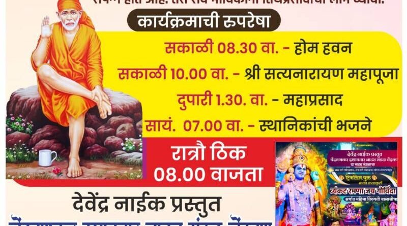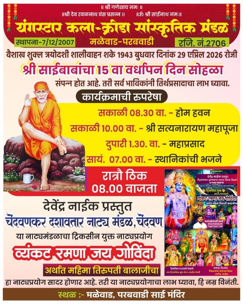 *ЁЯО┤рд╕рд╛рд╡рдВрддрд╡рд╛рдбреА, рджрд┐- реиреж:-* рдорд│реЗрд╡рд╛рдб-рдкрд░рдмрд╡рд╛рдбреА рдпреЗрдереЗ рдмреБрдзрд╡рд╛рд░ рджрд┐рдирд╛рдВрдХ реиреп рдПрдкреНрд░рд┐рд▓ рд░реЛрдЬреА рд╢реНрд░реА рд╕рд╛рдИрдмрд╛рдмрд╛рдВрдЪрд╛ резрел рд╡рд╛ рд╡рд░реНрдзрд╛рдкрди рджрд┐рди рд╕реЛрд╣рд│рд╛ рд╕рдВрдкрдиреНрди рд╣реЛрдд рдЕрд╕реВрди, рдордВрджрд┐рд░рд╛рдд рд╕рдХрд╛рд│реА рео:рейреж рд╡рд╛. рд╣реЛрдо рд╣рд╡рди,рд╕рдХрд╛рд│реАрезреж рд╡рд╛. рд╢реНрд░реА рд╕рддреНрдпрдирд╛рд░рд╛рдпрдг рдорд╣рд╛рдкреВрдЬрд╛, ,рдЖрд░рддреА, рддреАрд░реНрдердкреНрд░рд╕рд╛рдж,рджреБрдкрд╛рд░реА рез:рейреж рд╡рд╛. рдорд╣рд╛рдкреНрд░рд╕рд╛рдж,рд╕рд╛рдпрдВ. ренрд╡рд╛. рд╕реНрдерд╛рдирд┐рдХрд╛рдВрдЪреА рднрдЬрдиреЗ рддрд╕реЗрдЪ рд░рд╛рддреНрд░реМ рео рд╡рд╛рдЬрддрд╛ рджреЗрд╡реЗрдВрджреНрд░ рдирд╛рдИрдХ рдкреНрд░рд╕реНрддреБрдд рдЪреЗрдВрджрд╡рдгрдХрд░ рджрд╢рд╛рд╡рддрд╛рд░ рдирд╛рдЯреНрдп рдордВрдбрд│, рдЪреЗрдВрджрд╡рдг рдпрд╛рдВрдЪрд╛ рдЯреНрд░рд┐рдХрд╕реАрдирдпреБрдХреНрдд “рд╡реНрдпрдВрдХрдЯ рд░рдордгрд╛ рдЬрдп рдЧреЛрд╡рд┐рдВрджрд╛” рдЕрд░реНрдерд╛рдд ‘рдорд╣рд┐рдорд╛ рддрд┐рд░реБрдкрддреА рдмрд╛рд▓рд╛рдЬреАрдЪрд╛”