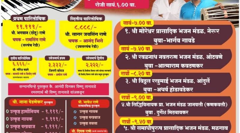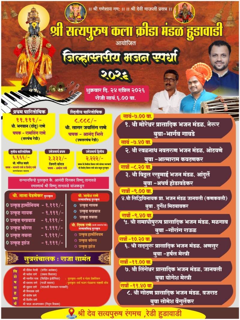 рддрд░реА рдпрд╛ рднрдЬрди рд╕реНрдкрд░реНрдзреЗрд▓рд╛ рд╕рд░реНрд╡рд╛рдВрдиреА рдЙрдкрд╕реНрдерд┐рдд рд░рд╛рд╣рдгреНрдпрд╛рдЪреЗ рдЖрд╡рд╛рд╣рди рд╢реНрд░реА рд╕рддреНрдпрдкреБрд░реБрд╖ рдХрд▓рд╛ рдХреНрд░реАрдбрд╛ рдордВрдбрд│,рд░реЗрдбреА рд╣реБрдбрд╛рд╡рд╛рдбреА рд╡ рдЧреНрд░рд╛рдорд╕реНрдерд╛рдВрдиреА рдХреЗрд▓реЗ рдЖрд╣реЗ.