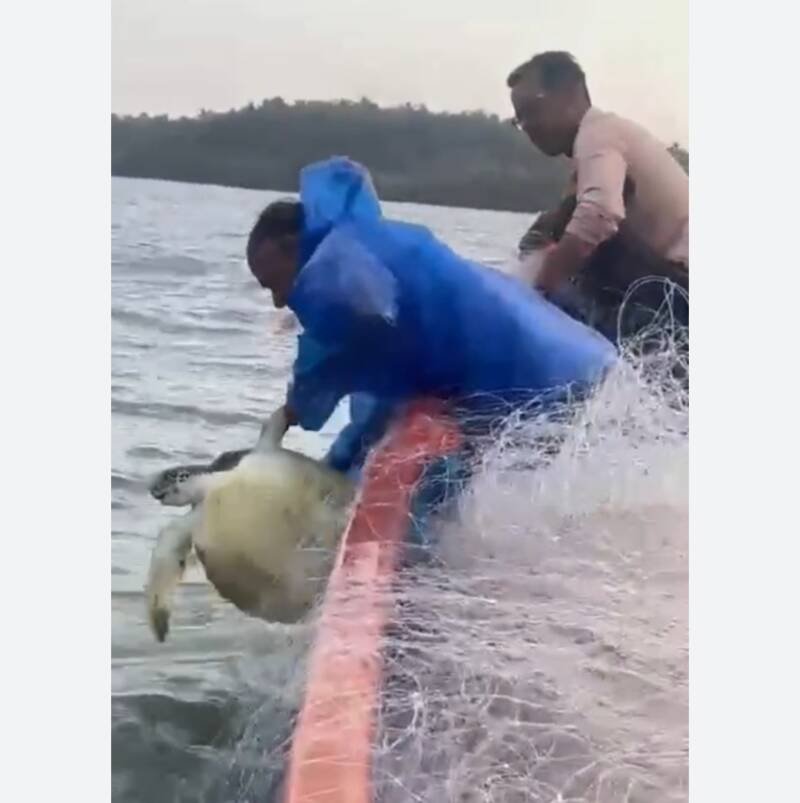 *🎴मालवण, दि- २४:-* मालवण राजकोट येथील छत्रपती शिवाजी महाराजांच्या पुतळ्यासमोरील समुद्रात पारंपरिक मच्छीमार सन्मेष परब हे मासेमारीला गेले असता, त्यांच्या जाळ्यात समुद्री कासव अडकल्याचे निदर्शनास आले. परब यांनी आपले मासेमारीचे जाळे – फाडून त्या ‘ग्रीन सी टर्टलची जाळ्यामधून सुटका केली.
