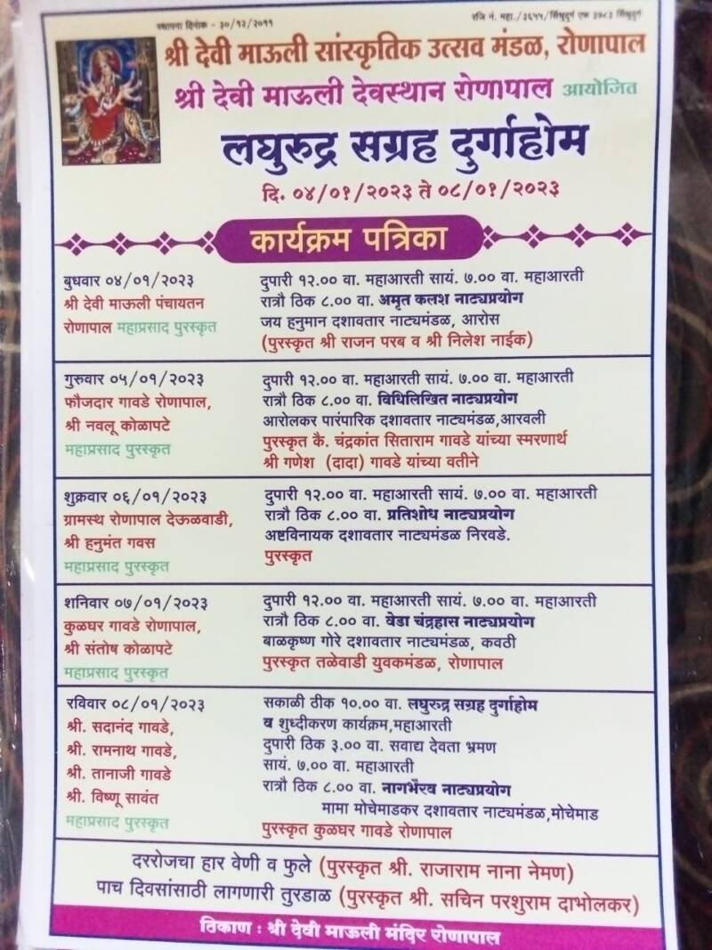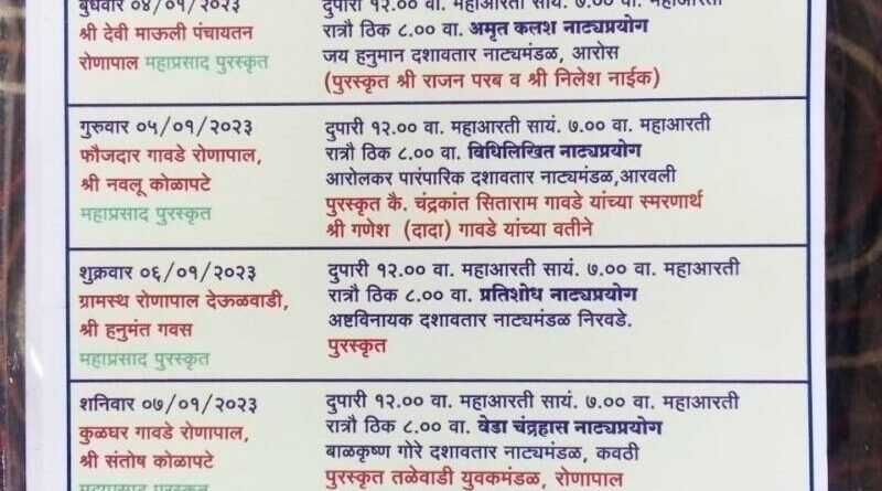 рдлреМрдЬрджрд╛рд░ рдЧрд╛рд╡рдбреЗ рд╡ рдирд╡рд▓реВ рдХреЛрд│рд╛рдкрдЯреЗ рдпрд╛рдВрдЪреНрдпрд╛рддрд░реНрдлреЗ, рд╢реБрдХреНрд░рд╡рд╛рд░ рджрд┐рдирд╛рдВрдХ режрем рдЬрд╛рдиреЗрд╡рд╛рд░реА реирежреирей рд░реЛрдЬреА рдЧреНрд░рд╛рдорд╕реНрде рд░реЛрдгрд╛рдкрд╛рд▓ рджреЗрдКрд│рд╡рд╛рдбреА рд╣рдиреБрдордВрдд рдЧрд╡рд╕ рдпрд╛рдВрдЪреНрдпрд╛ рддрд░реНрдлреЗ,рд╢рдирд┐рд╡рд╛рд░ рджрд┐рдирд╛рдВрдХ режрен рдЬрд╛рдиреЗрд╡рд╛рд░реА реирежреирей рд░реЛрдЬреА рдХреБрд│рдШрд░ рдЧрд╛рд╡рдбреЗ рд░реЛрдгрд╛рдкрд╛рд▓ рдЪреЗ рд╕рдВрддреЛрд╖ рдХреЛрд│рд╛рдкрдЯреЗ рддрд╕реЗрдЪ рд░рд╡рд┐рд╡рд╛рд░ рджрд┐рдирд╛рдВрдХ режрео рдЬрд╛рдиреЗрд╡рд╛рд░реА реирежреирей рд░реЛрдЬреА рд╕рджрд╛рдирдВрдж рдЧрд╛рд╡рдбреЗ,рд░рд╛рдордирд╛рде рдЧрд╛рд╡рдбреЗ,рддрд╛рдирд╛рдЬреА рдЧрд╛рд╡рдбреЗ,рд╡рд┐рд╖реНрдгреВ рд╕рд╛рд╡рдВрдд рдпрд╛рдВрдЪреНрдпрд╛рддрд░реНрдлреЗ рдорд╣рд╛рдкреНрд░рд╕рд╛рдж рдкреБрд░рд╕реНрдХреГрдд рд╣реЛрдгрд╛рд░ рдЖрд╣реЗ. рддрд░ рджрд░рд░реЛрдЬрдЪрд╛ рд╣рд╛рд░ рд╡реЗрдгреА рд╡ рдлреБрд▓реЗ рд░рд╛рдЬрд╛рд░рд╛рдо рдирд╛рдирд╛ рдиреЗрдордг рдпрд╛рдВрдЪреНрдпрд╛рддрд░реНрдлреЗ рд╡ рдкрд╛рдЪ рджрд┐рд╡рд╕рд╛рдВрд╕рд╛рдареА рд▓рд╛рдЧрдгрд╛рд░реА рддреБрд░рдбрд╛рд│ рд╕рдЪрд┐рди рдкрд░рд╢реБрд░рд╛рдо рджрд╛рднреЛрд▓рдХрд░ рдпрд╛рдВрдЪреНрдпрд╛рддрд░реНрдлреЗ рдкреБрд░рд╕реНрдХреГрдд рд╣реЛрдгрд╛рд░ рдЖрд╣реЗ.