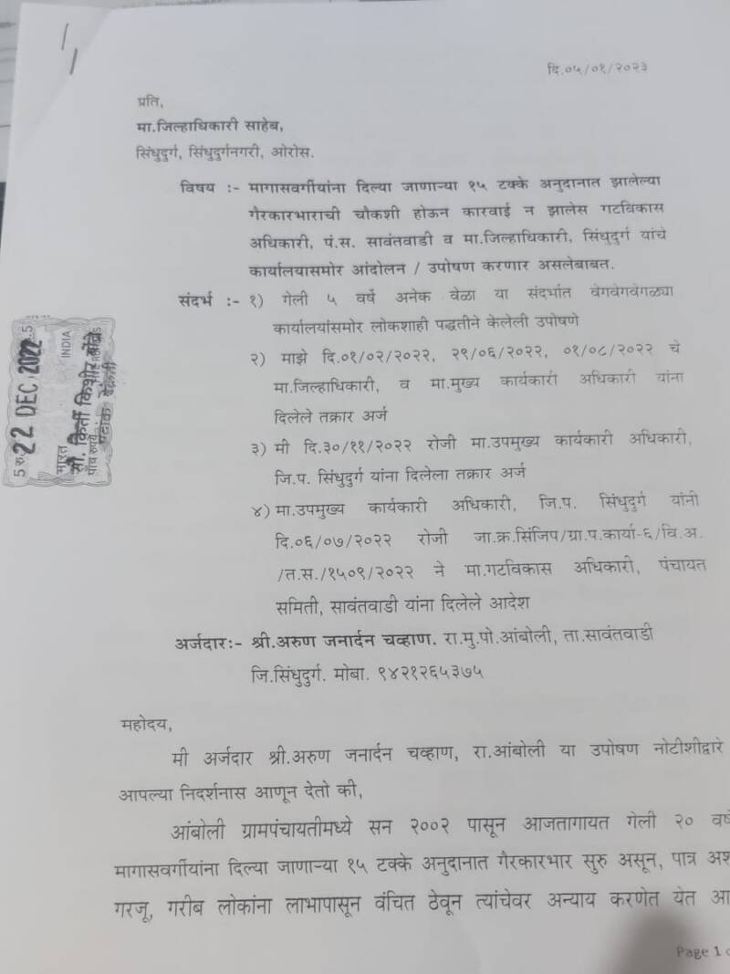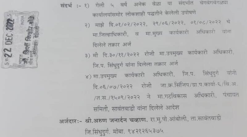 рдорд╛.рдЧрдЯрд╡рд┐рдХрд╛рд╕ рдЕрдзрд┐рдХрд╛рд░реА, рдкрдВ.рд╕. рдпрд╛рдВрдиреА рдЕрдзрд┐рдХрд╛рд░реА, рдЬрд┐.рдк. рд╕рд┐рдВрдзреБрджреБрд░реНрдЧ рдпрд╛рдВрдЪреНрдпрд╛ рдЖрджреЗрд╢рд╛рдЪреЗ рдкрд╛рд▓рди рдХрд░реВрди рдХрд╛рд░реНрдпрд╡рд╛рд╣реА рд╡ рдХрд╛рд░рд╡рд╛рдИ рди рдХрд░рддрд╛ рдкрд╛рдареАрд╢реА рдШрд╛рддрд▓реЗрд▓реЗ рдЖрд╣реЗ. рддреНрдпрд╛рдореБрд│реЗ рдпрд╛рдЪреА рдЪреМрдХрд╢реА рджрд┐.резрел рдЬрд╛рдиреЗрд╡рд╛рд░реА реирежреирей рдкрд░реНрдпрдВрдд рди рдЭрд╛рд▓реНрдпрд╛рд╕ рджрд┐.резрем рдЬрд╛рдиреЗрд╡рд╛рд░реА реирежреирей рд░реЛрдЬреА, рдорд▓рд╛ рдорд╛рдЭреНрдпрд╛ рдорд┐рддреНрд░рдкрд░рд┐рд╡рд╛рд░рд╛рд╕рд╣ рдорд╛ рдЧрдЯрд╡рд┐рдХрд╛рд╕ рдЕрдзрд┐рдХрд╛рд░реА, рдкрдВрдЪрд╛ рд╕рдорд┐рддреА рд╕рд╛рд╡рдВрддрд╡рд╛рдбреА рдпрд╛рдВрдЪреЗ рдХрд╛рд░реНрдпрд╛рд▓рдпрд╛рд╕рдореЛрд░ рдЖрдВрджреЛрд▓рди/ рдЙрдкреЛрд╖рдг рдХрд░рдгреЗ рднрд╛рдЧ рдкрдбрдгрд╛рд░ рдЖрд╣реЗ. рдЕрд╕реЗ рдЪрд╡реНрд╣рд╛рдг рдпрд╛рдВрдиреА рджрд┐рд▓реЗрд▓реНрдпрд╛ рдкрддреНрд░рд╛рдд рдореНрд╣рдЯрд▓реЗ рдЖрд╣реЗ. рддрд╕реЗрдЪ рддреНрдпрд╛рдирдВрддрд░рд╣реА рдорд▓рд╛ рдиреНрдпрд╛рдп рди рдорд┐рд│рд╛рд▓реНрдпрд╛рд╕ рд╡ рджреЛрд╖реАрд╡рд░ рдХрд╛рд░рд╡рд╛рдИ рди рдЭрд╛рд▓реНрдпрд╛рд╕ рджрд┐. реирем рдЬрд╛рдиреЗрд╡рд╛рд░реА реирежреирей рд░реЛрдЬреА рдорд▓рд╛ рдорд╛рдЭреНрдпрд╛ рдорд┐рддреНрд░рдкрд░рд┐рд╡рд╛рд░рд╛рд╕рд╣ рдЬрд┐рд▓реНрд╣рд╛рдзрд┐рдХрд╛рд░реА, рд╕рд┐рдВрдзреБрджреБрд░реНрдЧ рдпрд╛рдВрдЪреЗ рдХрд╛рд░реНрдпрд╛рд▓рдпрд╛рд╕рдореЛрд░ рдЖрдВрджреЛрд▓рди/рдЙрдкреЛрд╖рдг рдХрд░рдгреЗ рднрд╛рдЧ рдкрдбрдгрд╛рд░ рдЖрд╣реЗ.рд╡рд╛рд░рдВрд╡рд╛рд░ рдкреНрд░рд╢рд╛рд╕рдирд╛рдЪреЗ рд▓рдХреНрд╖ рд╡реЗрдзреВрди рд╕реБрджреНрдзрд╛ рдЧреИрд░рд╡реНрдпрд╡рд╣рд╛рд░рд╛рдЪреА рдЪреМрдХрд╢реА рд╣реЛрдд рдирд╛рд╣реА, рд╡рд░рд┐рд╖реНрдард╛рдВрдЪреЗ рдЖрдкрд▓реНрдпрд╛ рдЕрдЦрддреНрдпрд╛рд░реАрддреАрд▓ рдЕрдзрд┐рдХрд╛рд▒реНрдпрд╛рдВрд╡рд░ рд╡ рдХрд░реНрдордЪрд╛рдиреНрдпрд╛рдВрд╡рд░ рдХреЛрдгрддреЗрд╣реА рдирд┐рдпрдВрддреНрд░рдг рдирд╛рд╣реА, рджреЛрд╖реА рдХрд░реНрдордЪрд╛рд▒реНрдпрд╛рдВрдирд╛ рдкрд╛рдард╢реА рдШрд╛рд▓рдгреНрдпрд╛рддрдЪ рд╡рд░реАрд╖реНрда рдЕрдзрд┐рдХрд╛рд░реА рдорди рдЕрд╕рд▓реНрдпрд╛рдиреЗ, рдЭреЛрдкрд▓реЗрд▓реНрдпрд╛ рдкреНрд░рд╢рд╛рд╕рдирд╛рд▓рд╛ рдЬрд╛рдЧреЗ рдХрд░рдгреНрдпрд╛рд╕рд╛рдареА рд╢реЗрд╡рдЯрдЪрд╛ рдкреНрд░рдпрддреНрди рдореНрд╣рдгреВрди рдорд▓рд╛ рдорд╛. рдЬрд┐рд▓реНрд╣рд╛рдзрд┐рдХрд╛рд░реА рдпрд╛рдВрдЪреЗ рдХрд╛рд░реНрдпрд╛рд▓рдпрд╛рд╕рдореЛрд░ рдЖрддреНрдорджрд╣рди рдХрд░рдгреЗ рднрд╛рдЧ рдкрдбрдгрд╛рд░ рдЖрд╣реЗ. рдпрд╛рдЪреА рд╕рд░реНрд╡рд╕реНрд╡реА рдЬрдмрд╛рдмрджрд╛рд░реА рд╕рдВрдмрдВрдзрд┐рдд рдЧреНрд░рд╛рдорд╡рд┐рдХрд╛рд╕ рдЕрдзрд┐рдХрд╛рд░реА, рдЧрдЯрд╡рд┐рдХрд╛рд╕ рдЕрдзрд┐рдХрд╛рд░реА рд╡ рд╕рдВрдмрдВрдзрд┐рдд рд╡рд░реАрд╖реНрда рдЕрдзрд┐рдХрд╛рд░реА рддрд╕реЗрдЪ рдкреНрд░рд╢рд╛рд╕рдирд╛рдЪреА рд░рд╛рд╣реАрд▓ рдпрд╛рдЪреА рдиреЛрдВрдж рдШреНрдпрд╛рд╡реА рдЕрд╕реЗ рдкрддреНрд░ рдЖрдВрдмреЛрд▓реА рдпреЗрдереАрд▓ рдЕрд░реБрдг рдЪрд╡реНрд╣рд╛рдг рдпрд╛рдВрдиреА рджрд┐р