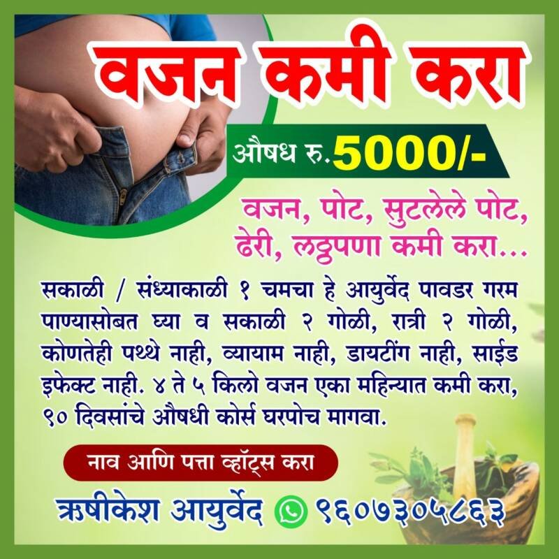 सुटलेले पोट,वजन कमी करा. लठ्ठपणा जाडी, चरबी कमी करण्याचे प्रभावी गुणकारी आयुर्वेदिक औषध फक्त रुपये 5000 मध्ये..