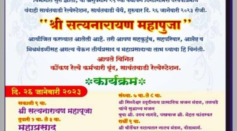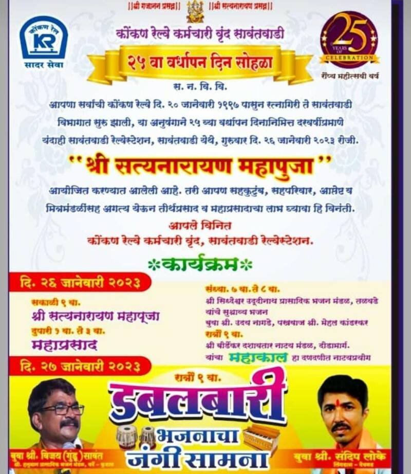 рд╢реНрд░реА рд╕рддреНрдпрдирд╛рд░рд╛рдпрдг рдорд╣рд╛рдкреВрдЬрд╛,рджреБрдкрд╛рд░реА 1.00 рддреЗ 3.00 рдпрд╛ рд╡реЗрд│реЗрдд рдорд╣рд╛рдкреНрд░рд╕рд╛рдж рддрд░ рд╕рдВрдзреНрдпрд╛рдХрд╛рд│реА 7.00 рддреЗ рд░рд╛рддреНрд░реМ 8.00 рдпрд╛ рд╡реЗрд│реЗрдд рд╢реНрд░реА рд╕рд┐рдзреНрджреЗрд╢реНрд╡рд░ рдЙрджреНрджреАрдирд╛рде рдкреНрд░рд╛рд╕рд╛рджрд┐рдХ рднрдЬрди рдордВрдбрд│ рддрд│рд╡рдбреЗ рдпрд╛рдВрдЪреЗ рд╕реБрд╢реНрд░рд╛рд╡реНрдп рднрдЬрди рд╣реЛрдгрд╛рд░ рдЕрд╕реВрди рдмреБрд╡рд╛ рдЙрджрдп рдирд╛рдЧрдбреЗ рд╣реЗ рддрд░ рдкрдЦрд╡рд╛рдЬ рдореЗрд╣рд▓ рдХрд╛рдВрдбрд░рдХрд░ рд╣реЗ рдЖрд╣реЗрдд.рд░рд╛рддреНрд░реМ 9.00 рд╡рд╛рдЬрддрд╛ рд╢реНрд░реА рдмреАрд░реНрдбреЗрдХрд░ рджрд╢рд╛рд╡рддрд╛рд░ рдирд╛рдЯрдп рдордВрдбрд│, рджреЛрдбрд╛рдорд╛рд░реНрдЧ рдпрд╛рдВрдЪрд╛ “рдорд╣рд╛рдХрд╛рд▓” рд╣рд╛ рджрдгрджрдгреАрдд рджрд╢рд╛рд╡рддрд╛рд░ рдирд╛рдЯреНрдпрдкреНрд░рдпреЛрдЧ рд╣реЛрдгрд╛рд░ рдЖрд╣реЗ. рджреБрд╕рд▒реНрдпрд╛ рджрд┐рд╡рд╢реА рджрд┐рдирд╛рдВрдХ 27 рдЬрд╛рдиреЗрд╡рд╛рд░реА 2023 рд░реЛрдЬреА рдмреБрд╡рд╛ рд╡рд┐рдЬрдп (рдЧреБрдВрдбреВ) рд╕рд╛рд╡рдВрдд рд╡ рдмреБрд╡рд╛ рд╕рдВрджрд┐рдк рд▓реЛрдХреЗ рдпрд╛рдВрдЪрд╛ рдбрдмрд▓рдмрд╛рд░реА рднрдЬрдирд╛рдЪрд╛ рдЬрдВрдЧреА рд╕рд╛рдордирд╛ рд╣реЛрдгрд╛рд░ рдЖрд╣реЗ. рд╢реНрд░реА рд╕рддреНрдпрдирд╛рд░рд╛рдпрдг рдорд╣рд╛рдкреВрдЬрд╛, рджрд╢рд╛рд╡рддрд╛рд░ рдирд╛рдЯреНрдпрдкреНрд░рдпреЛрдЧ рддрд╕реЗрдЪ рднрдЬрди рд╡ рдбрдмрд▓рдмрд╛рд░реА рдЬрдВрдЧреА рд╕рд╛рдордиреНрдпрд╛рд╕ рд░рд╕рд┐рдХрд╛рдВрдиреА рд╕рд╣рдХреБрдЯреБрдВрдм, рд╕рд╣рдкрд░рд┐рд╡рд╛рд░, рдЖрдкреНрддреЗрд╖реНрдЯ рд╡ рдорд┐рддреНрд░рдордВрдбрд│реАрдВрд╕рд╣ рдЕрдЧрддреНрдп рдпреЗрдКрди рд▓рд╛рдн рдШреНрдпрд╛рд╡рд╛ рд╡ рддреАрд░реНрдердкреНрд░рд╕рд╛рдж рддрд╕реЗрдЪ рдорд╣рд╛рдкреНрд░рд╕рд╛рджрд╛рдЪрд╛ рд▓рд╛рдн рдШреНрдпрд╛рд╡рд╛, рдЕрд╕реЗ рдЖрд╡рд╛рд╣рди рдХреЛрдВрдХрдг рд░реЗрд▓реНрд╡реЗ рдХрд░реНрдордЪрд╛рд░реА рд╡реГрдВрдж, рд╕рд╛рд╡рдВрддрд╡рд╛рдбреА рд░реЗрд▓реНрд╡реЗрд╕реНрдЯреЗрд╢рди рдпрд╛рдВрдиреА рдХреЗрд▓реЗ рдЖрд╣реЗ.