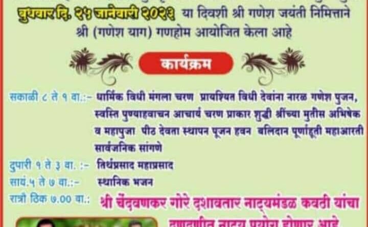 *ЁЯО┤рд╕рд╛рд╡рдВрддрд╡рд╛рдбреА, рджрд┐-реирел:-* рд╢реНрд░реА рдЧрдгреЗрд╢ рдорд┐рддреНрд░рдордВрдбрд│,рдорд│реЗрд╡рд╛рдбрдЪреНрдпрд╛ рд╡рддреАрдиреЗ рд╢реНрд░реА рдорд╛рдШреА рдЧрдгреЗрд╢ рдЬрдпрдВрддреА рдирд┐рдорд┐рддреНрдд рд╢реНрд░реА рдЧрдгреЗрд╢ рдпрд╛рдЧ рд╡ рдзрд╛рд░реНрдорд┐рдХ рд╡рд┐рдзреА рд╢реНрд░реА рд╢рд╛рд▓рд┐рд╡рд╛рд╣рди рд╢рдХреЗ 1944 рд╢реБрднрдХреГрдд рдирд╛рдо рд╕рдВрд╡рддреНрд╕рд░ рдорд╛рдШ рдорд╛рд╕ рддрд┐рдереА рд╢реБ. рдЪрддреБрд░реНрдереА рдмреБрдзрд╡рд╛рд░ рджрд┐рдирд╛рдВрдХ 25 рдЬрд╛рдиреЗрд╡рд╛рд░реА 2023 рдпрд╛ рджрд┐рд╡рд╢реА рд╢реНрд░реА рдЧрдгреЗрд╢ рдЬрдпрдВрддреА рдирд┐рдорд┐рддреНрддрд╛рдиреЗ рд╢реНрд░реА (рдЧрдгреЗрд╢ рдпрд╛рдЧ) рдЧрдгрд╣реЛрдо рдЖрдпреЛрдЬрд┐рдд рдХрд░рдгреНрдпрд╛рдд рдЖрд▓рд╛ рдЖрд╣реЗ.