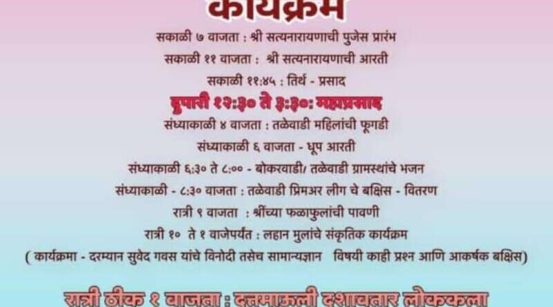 *ЁЯО┤рджреЛрдбрд╛рдорд╛рд░реНрдЧ, рджрд┐-реирел:-* рд╕рд╛рд▓рд╛рдмрд╛рджрдкреНрд░рдорд╛рдгреЗ рдЧреБрд░реБрд╡рд╛рд░ рджрд┐рдирд╛рдВрдХ реиремрдЬрд╛рдиреЗрд╡рд╛рд░реА реирежреирей рд░реЛрдЬреА рдкреНрд░рдЬрд╛рд╕рддреНрддрд╛рдХ рджрд┐рдирд╛рдирд┐рдорд┐рддреНрдд рдпрдВрджрд╛рд╣реА рдорд╛рдВрдЧреЗрд▓реА рддрд│реЗрд╡рдбреАрдд рд╡рд┐рд╡рд┐рдз рд╕рд╛рдорд╛рдЬрд┐рдХ, рд╕рдВрд╕реНрдХреГрддреАрдХ, рдЖрдгрд┐ рдзрд╛рд░реНрдорд┐рдХ рдХрд╛рд░реНрдпрдХреНрд░рдорд╛рдВрдЪреЗ рдЖрдпреЛрдЬрди рдХрд░рдгреНрдпрд╛рдд рдЖрд▓реЗ рдЖрд╣реЗ. рд╕рдХрд╛рд│реА рен рд╡рд╛рдЬрддрд╛ рд╢реНрд░реА рд╕рддреНрдпрдирд╛рд░рд╛рдпрдг рдкреВрдЬрд╛ рджреБрдкрд╛рд░реА резреи.рейрежрддреЗрей.рейрежрдорд╣рд╛рдкреНрд░рд╕рд╛рдж, рд╕рдВрдзреНрдпрд╛рдХрд╛рд│реА рекрд╡рд╛. рдорд╣рд┐рд▓рд╛рдВрдЪреА рдлреБрдЧрдбреА, рд╕рдВрдзреНрдпрд╛рдХрд╛рд│реА ремрд╡рд╛. рдЧреНрд░рд╛рдорд╕реНрдерд╛рдВрдЪреЗ рднрдЬрди,рео.рейреж рд╡рд╛. рддрд│реЗрд╡рд╛рдбреА рдкреНрд░рд┐рдорд┐рдпрд░ рд▓реАрдЧрдЪреЗ рдмрдХреНрд╖реАрд╕ рд╡рд┐рддрд░рдг, рд░рд╛рддреНрд░реА резрежрд╡рд╛.рд▓рд╣рд╛рди рдореБрд▓рд╛рдВрдЪреЗ рд╕рдВрд╕реНрдХреГрддреАрдХ рдХрд╛рд░реНрдпрдХреНрд░рдо, рд░рд╛рддреНрд░реА резрд╡рд╛. рджрддреНрдд рдорд╛рдКрд▓реА рджрд╢рд╛рд╡рддрд╛рд░ рд▓реЛрдХрдХрд▓рд╛ рдирд╛рдЯреНрдп рдордВрдбрд│ рд╕рд┐рдВрдзреБрджреБрд░реНрдЧ рдпрд╛рдВрдЪрд╛ рд╢реЗрд╖рд╛рддреНрдордЬ рдЧрдгреЗрд╢ рд╣рд╛ рджрдгрджрдгреАрдд рдирд╛рдЯреНрдпрдкреНрд░рдпреЛрдЧ рд╕рд╛рджрд░ рд╣реЛрдгрд╛рд░ рдЖрд╣реЗ. рдпрд╛ рд╕рд░реНрд╡ рд╕реЛрд╣рд│реНрдпрд╛рдЪреЗ рддрд╕реЗрдЪ рдирд╛рдЯреНрдпрдкреНрд░рдпреЛрдЧрд╛рдЪрд╛ рд▓рд╛рдн рдШреНрдпрд╛рд╡рд╛ рдЕрд╕реЗ рдЖрд╡рд╛рд╣рди рдорд╛рдВрдЧреЗрд▓реА рдЧреНрд░рд╛рдорд╕реНрдерд╛рдВрдиреА рдХреЗрд▓реЗ рдЖрд╣реЗ.