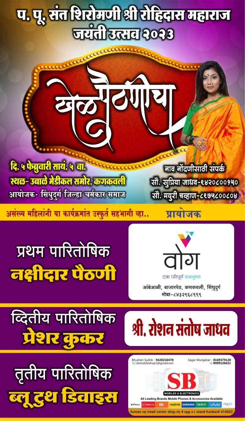 *ЁЯО┤рдХрдгрдХрд╡рд▓реА, рджрд┐-режрей:-* рдк.рдкреВ. рд╕рдВрдд рд╢рд┐рд░реЛрдордгреА рд░рд╡рд┐рджрд╛рд╕ рдорд╣рд╛рд░рд╛рдЬ рдЬрдпрдВрддреА рдЙрддреНрд╕рд╡рдирд┐рдорд┐рддреНрдд рдорд╣рд┐рд▓рд╛рдВрд╕рд╛рдареА рдЦрд╛рд╕ рдЖрдХрд░реНрд╖рдг рдореНрд╣рдгреВрди “рдЦреЗрд│ рдкреИрдардгреАрдЪрд╛” рдХрд╛рд░реНрдпрдХреНрд░рдо рдЖрдпреЛрдЬрд┐рдд рдХрд░рдгреНрдпрд╛рдд рдЖрд▓рд╛ рдЖрд╣реЗ. рд╣рд╛ рдХрд╛рд░реНрдпрдХреНрд░рдо рел рдлреЗрдмреНрд░реБрд╡рд╛рд░реА рд░реЛрдЬреА рд╕рд╛рдпрдВ.рел рд╡рд╛. рдЙрдмрд╛рд│реЗ рдореЗрдбрд┐рдХрд▓ рдХрдгрдХрд╡рд▓реА рд╕рдореЛрд░ рд╕реБрд░реБ рдХрд░рдгреНрдпрд╛рдд рдпреЗрдИрд▓. рдпрд╛ рдХрд╛рд░реНрдпрдХреНрд░рдорд╛рдд рдкреНрд░рдердо рдкрд╛рд░рд┐рддреЛрд╖рд┐рдХ рдирдХреНрд╖реАрджрд╛рд░ рдкреИрдардгреА, рджреНрд╡рд┐рддреАрдп рдкрд╛рд░рд┐рддреЛрд╖рд┐рдХ рдкреНрд░реЗрд╢рд░ рдХреБрдХрд░, рддреГрддреАрдп рдкрд╛рд░рд┐рддреЛрд╖рд┐рдХ рдмреНрд▓реБрдЯреВрде рдбрд┐рд╡реНрд╣рд╛рдИрд╕ рддрд╕реЗрдЪ рд╕рд╣рднрд╛рдЧреА рд╕реНрдкрд░реНрдзрдХрд╛рдВрдирд╛ рднреЗрдЯрд╡рд╕реНрддреВ рджреЗрдгреНрдпрд╛рдд рдпреЗрддреАрд▓. рдпрд╛ рдХрд╛рд░реНрдпрдХреНрд░рдорд╛рдд рдирд╛рд╡рдиреЛрдВрджрдгреА рдХрд░рдгреНрдпрд╛рд╕рд╛рдареА рд╕реМ. рд╕реБрдкреНрд░рд┐рдпрд╛ рдЬрд╛рдзрд╡- 9420800150 рд╡ рд╕реМ. рдордпреБрд░реА рдЪрд╡реНрд╣рд╛рдг- 8975800804 рдпрд╛рдВрдЪреНрдпрд╛рд╢реА рд╕рдВрдкрд░реНрдХ рдХрд░рд╛рд╡рд╛.