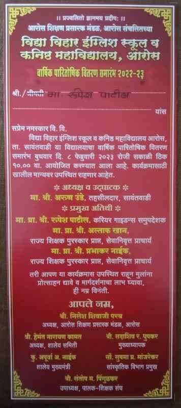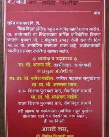 рддрд░реА рдпрд╛ рдХрд╛рд░реНрдпрдХреНрд░рдорд╛рд╕ рдЖрд░реЛрд╕ рдкрдВрдЪрдХреНрд░реЛрд╢реАрддреАрд▓ рд╢рд┐рдХреНрд╖рдг рдкреНрд░реЗрдореА, рдорд╛рдЬреА рд╡рд┐рджреНрдпрд╛рд░реНрдереА, рдкрд╛рд▓рдХ рд╡рд░реНрдЧ рдпрд╛рдВрдиреА рдЙрдкрд╕реНрдерд┐рдд рд░рд╛рд╣реВрди рдореБрд▓рд╛рдВрдирд╛ рдкреНрд░реЛрддреНрд╕рд╛рд╣рди рджреНрдпрд╛рд╡реЗ рд╡ рдорд╛рд░реНрдЧрджрд░реНрд╢рдирд╛рдЪрд╛ рд▓рд╛рдн рдШреНрдпрд╛рд╡рд╛, рдЕрд╕реЗ рдЖрд╡рд╛рд╣рди рдирд┐рд▓реЗрд╢ рд╢рд┐рд╡рд╛рдЬреА рдкрд░рдм (рдЕрдзреНрдпрдХреНрд╖, рдЖрд░реЛрд╕ рд╢рд┐рдХреНрд╖рдг рдкреНрд░рд╕рд╛рд░рдХ рдордВрдбрд│, рдЖрд░реЛрд╕), рд╣реЗрдордВрдд рдирд╛рд░рд╛рдпрдг рдХрд╛рдордд (рдЕрдзреНрдпрдХреНрд╖, рд╢рд╛рд▓реЗрдп рд╕рдорд┐рддреА), рдХреБ. рдЕрдкреВрд░реНрд╡рд╛ рдЕ. рдирд╛рдИрдХ (рд╢рд╛рд▓реЗрдп рдореБрдЦреНрдпрдордВрддреНрд░реА), рд╕рджрд╛рд╢рд┐рд╡ рд░. рдзреБрдкрдХрд░ (рдореБрдЦреНрдпрд╛рдзреНрдпрд╛рдкрдХ), рдкреНрд░рд╛. рд╕реБрд╖рдорд╛ рдкреНрд░рд╡реАрдг рдорд╛рдВрдЬрд░реЗрдХрд░ (рд╕рд╛рдВрд╕реНрдХреГрддрд┐рдХ рд╡рд┐рднрд╛рдЧ рдкреНрд░рдореБрдЦ), рд╕рдВрддреЛрд╖ рдо. рдкрд┐рдВрдЧреБрд│рдХрд░ (рдЙрдкрд╛рдзреНрдпрдХреНрд╖, рдкрд╛рд▓рдХ-рд╢рд┐рдХреНрд╖рдХ рд╕рдВрдШ) рдпрд╛рдВрдиреА рдХрд│рд╡рд┐рд▓реЗ рдЖрд╣реЗ.