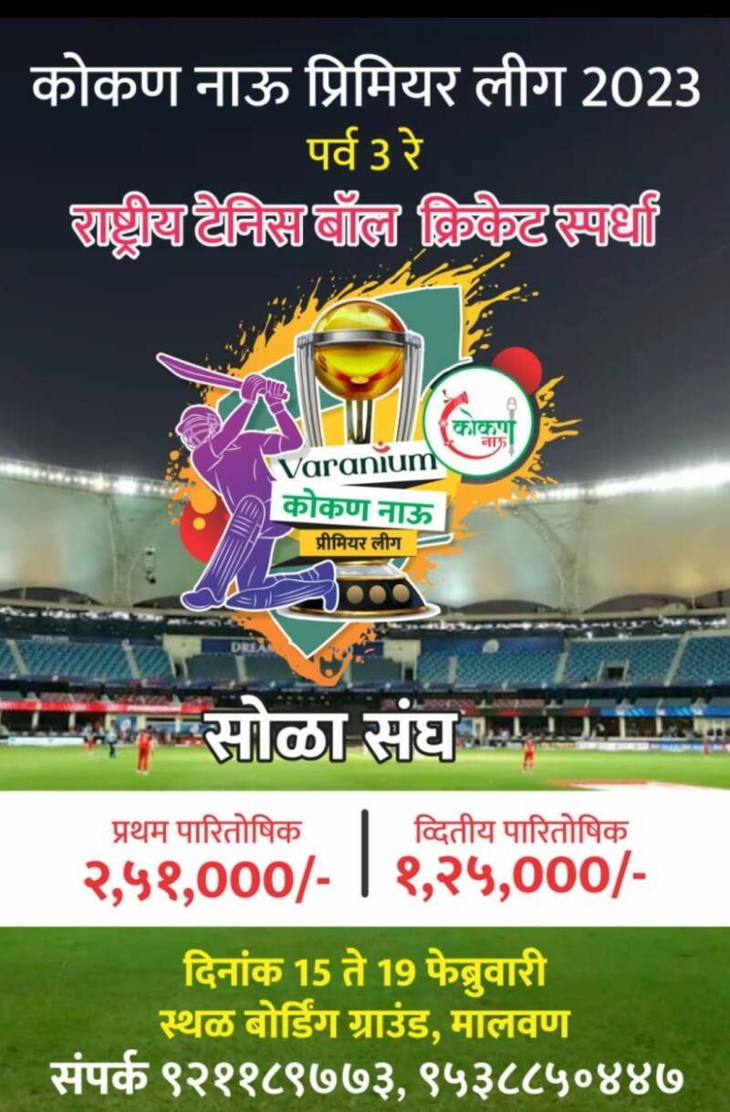 कोकणचं नंबर १ चं चॅनेल “कोकण नाऊ”तर्फे यावर्षीही ”व्हेरेनियम क्लाऊड” आयोजित ‘कोकण नाऊ प्रीमिअर लीग २०२३’ संपन्न होणार आहे. महाराष्ट्रातील तसेच अन्य राज्यातील गाजलेल्या टेनिस क्रिकेटपटूंमध्ये दि. १५ ते १९ फेब्रुवारी २०२३ दरम्यान मालवणच्या बोर्डिंग मैदानावर क्रिकेटचा हा महासंग्राम रंगलेला पाहायला मिळणार आहे. मागील दोन वर्षे कोकण नाऊ प्रीमिअर लीगला तुफान प्रतिसाद मिळाला होता.