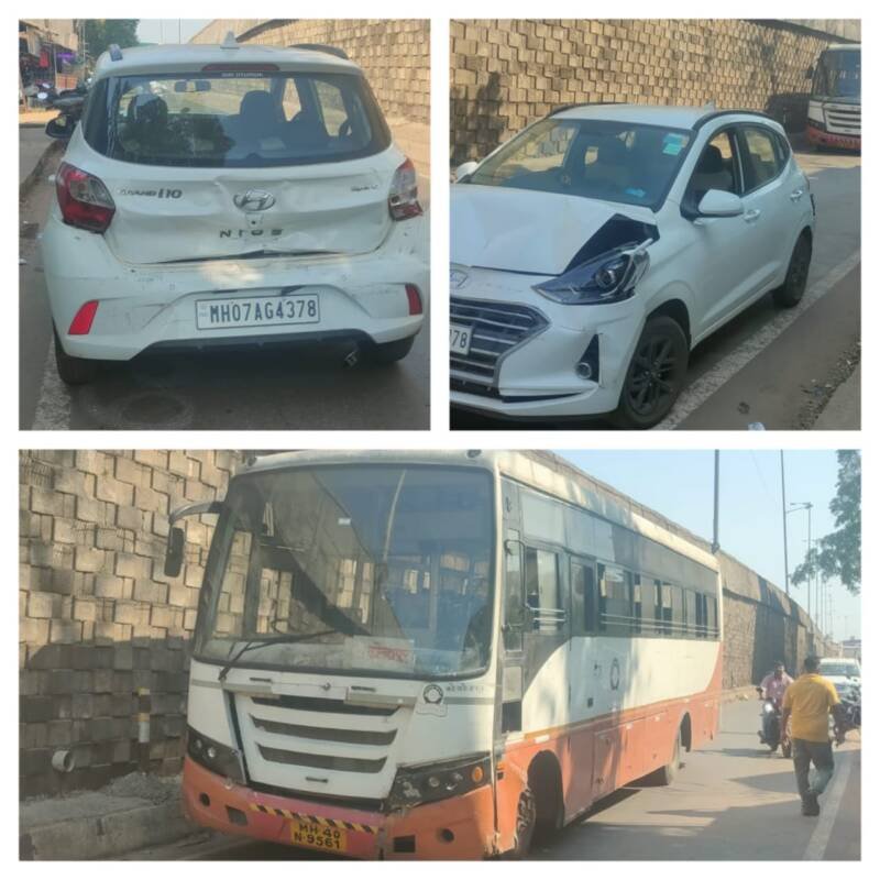 *🎴कणकवली, दि-१२:-* शहरातील नॅशनल हायवेवरील गांगोमंदिर सर्व्हिस रोडवर पुढे जात असलेल्या आय टेन कार ला मागून एसटी बसने जोरदार धडक दिली. त्यानंतर अपघातग्रस्त कार पुढे जात असलेल्या दुसऱ्या एसटी बसवर आदळून तिहेरी अपघात घडला. दुपारी 3 वाजण्याच्या सुमारास गांगोमंदिर नजीक सर्व्हिस रोडवर घडला. डॉ नयना शेट्टी ह्या आपल्या ताब्यातील आय टेन कार क्र. MH 07 AG 4378 घेऊन कलमठ च्या दिशेने जात होत्या त्यावेळी पणजीहून कोल्हापुर ला जाणाऱ्या एसटी बसची जोरात धडक शेट्टी यांच्या कार ला मागून बसली. यानंतर शेट्टी यांची कार पुढे देवरुख ला जात असलेल्या एस्टीवर आदळली. यात डॉ. शेट्टी यांच्या कारचे दर्शनी भागासह मोठे नुकसान झाले आहे. सर्व्हिस रोडवर झालेल्या अपघातामुळे काही वेळ वाहतूक कोंडी झाली होती. हवालदार राजेंद्र नानचे यांनी अपघातस्थळी जात प्राथमिक पाहणी करत वाहतूक सुरळीत केली.