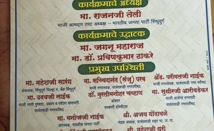 *ЁЯО┤рд╕рд╛рд╡рдВрддрд╡рд╛рдбреА, рджрд┐.резрек:-* рдЬрдп рд╕реЗрд╡рд╛рд▓рд╛рд▓ реиреорек рд╡реА рдЬрдпрдВрддреА рдЙрддреНрд╕рд╡ резрел рдлреЗрдмреНрд░реБрд╡рд╛рд░реА реирежреирей рд░реЛрдЬреА рд╕рдХрд╛рд│реА резрез.рейрежрд╡рд╛рдЬрддрд╛ рд╕рд╛рдИрд▓ рдирдЧрд░, рдмреЗрд│рдЧрд╛рдВрд╡ рд░реЛрдб рддрд╛. рд╕рд╛рд╡рдВрддрд╡рд╛рдбреА рдпреЗрдереЗ рд╣реЛрдгрд╛рд░ рд╕рд╛рдЬрд░рд╛ рдЖрд╣реЗ. рд╣реНрдпрд╛ рдХрд╛рд░реНрдпрдХрдорд╛рд▓рд╛ рдорд╛рдЬреА рдЖрдорджрд╛рд░ рддрдерд╛ рднрд╛рдЬрдкрд╛ рдЬрд┐рд▓реНрд╣рд╛рдзреНрдпрдХреНрд╖ рд░рд╛рдЬрди рддреЗрд▓реА, рдЬрдЧрдиреВ рдорд╣рд╛рд░рд╛рдЬ, рдбреЙ. рдкреНрд░рд╡реАрдгрдХреБрдорд╛рд░ рдард╛рдХрд░реЗ, рдорд╣реЗрд╢ рд╕рд╛рд░рдВрдЧ, рд╕рдВрдЬреВ рдкрд░рдм, рдЕрдБрдб рдкрд░рд┐рдорд▓ рдирд╛рдИрдХ, рдЙрджрдп рдирд╛рдИрдХ, рдбреЙ. рдореБрд░рд▓реАрдордиреЛрд╣рд░ рдЪрд╡реНрд╣рд╛рдг, рд╕реБрдзреАрд░ рдЖрдбреАрд╡рд░реЗрдХрд░, рдордиреЛрдЬ рдирд╛рдИрдХ, рдЕрдЬрдп рдЧреЛрдВрджрд╡рд│реЗ, рд░рд╡рд┐ рдордбрдЧрд╛рдВрд╡рдХрд░, рдорд╣реЗрд╢ рдзреБрд░реА рдЖрджреА рдЙрдкрд╕реНрдерд┐рдд рд░рд╛рд╣рдгрд╛рд░ рдЖрд╣реЗрдд.