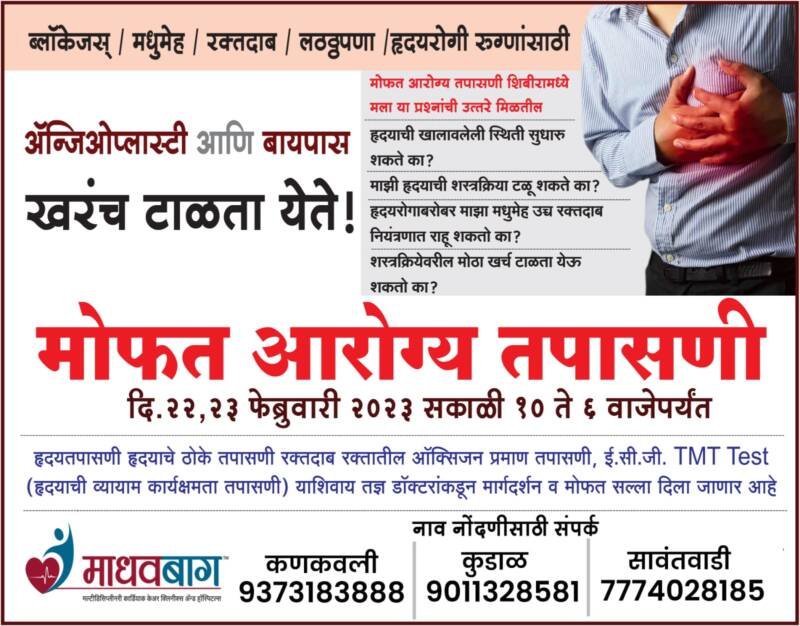 рд╣реЗ рдореЛрдлрдд рдЖрд░реЛрдЧреНрдп рддрдкрд╛рд╕рдгреА рд╢рд┐рдмрд┐рд░ рдЖрдЬ рджрд┐-22 рд╡ 23 рдлреЗрдмреНрд░реБрд╡рд╛рд░реА 2023 рд╕ -10 рддреЗ рд╕рд╛рдпрдВ 6 рдкрд░реНрдпрдВрдд рдЕрд╕рдгрд╛рд░ рдЖрд╣реЗ.