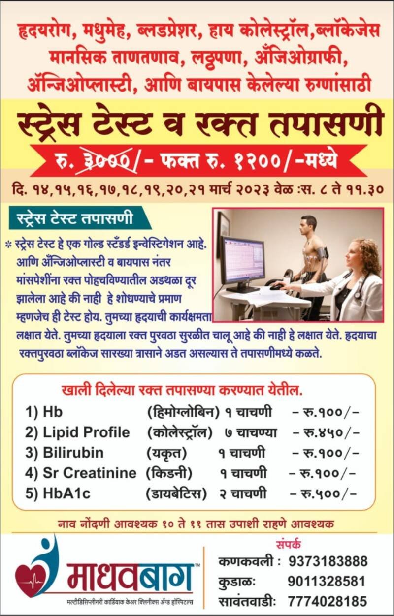 | सावंतवाडी:- माधवबाग परिवाराच्या माध्यमातून हृदयरोग रुग्णांसाठी तीन हजार रूपये किमतीची स्ट्रेस टेस्ट व रक्त तपासणी १ हजार २०० रुपयात उपलब्ध करुन देण्यात येणार आहे. ही सुविधा १४ ते २१ मार्च या कालावधी सकाळी ८ • ११.३० या वेळेत कणकवली, कुडाळ आणि सावंतवाडी या तीनही शाखांमध्ये उपलब्ध करुन देण्यात येणार आहे. ज्या रुग्णांना हृदयरोग, मधुमेह ब्लडप्रेशर, हाय कॉलेस्ट्रॉल, ब्लॉकेजेस, मानसिक ताणतणाव, लठ्ठपणा, अॅन्जिओग्राफी, अॅन्जीओप्लास्टी आणि बायपास झालेल्या रुग्णांनी या सेवेचा लाभ घ्यावा, असे आवाहन संस्थेच्या माध्यमातून करण्यात आले आहे. दरम्यान अधिक माहितीसाठी कणकवली – ९३७३१८३८८८, कुडाळ – ९०११३२८५८१, सावंतवाडी –