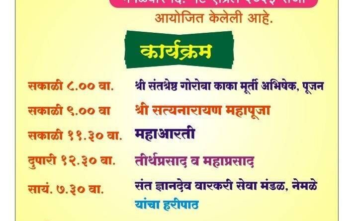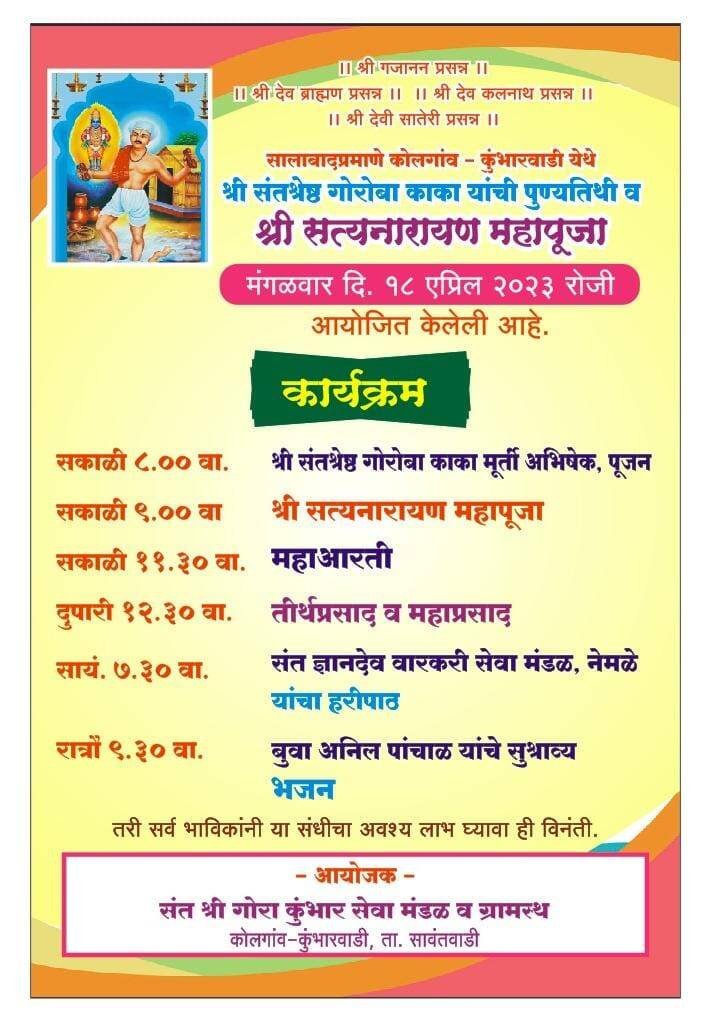*ЁЯО┤рд╕рд╛рд╡рдВрддрд╡рд╛рдбреА, рджрд┐.резрем:-* рджрд░рд╡рд░реНрд╖реА рдкреНрд░рдорд╛рдгреЗ рдХреЛрд▓рдЧрд╛рдВрд╡ рдХреБрдВрднрд╛рд░рд╡рд╛рдбреА рдпреЗрдереЗ рд╢реНрд░реА рд╕рдВрддрд╢реНрд░реЗрд╖реНрда рдЧреЛрд░реЛрдмрд╛ рдХрд╛рдХрд╛ рдпрд╛рдВрдЪреА рдкреБрдгреНрдпрддрд┐рдереА рдЙрддреНрд╕рд╡ рдордВрдЧрд│рд╡рд╛рд░ рджрд┐рдирд╛рдВрдХ резрео рдПрдкреНрд░рд┐рд▓ рд░реЛрдЬреА рд╕рд╛рдЬрд░рд╛ рдХрд░рдгреНрдпрд╛рдд рдпреЗрдгрд╛рд░ рдЖрд╣реЗ. рдпрд╛рдирд┐рдорд┐рддреНрдд рд╕рдХрд╛рд│реА рд╢реНрд░реА рд╕рдВрддрд╢реНрд░реЗрд╖реНрда рдЧреЛрд░реЛрдмрд╛ рдХрд╛рдХрд╛ рдореБрд░реНрддреА рдЕрднрд┐рд╖реЗрдХ, рдкреВрдЬрди рддреНрдпрд╛рдирдВрддрд░ рд╕рддреНрдпрдирд╛рд░рд╛рдпрдг рдорд╣рд╛рдкреВрдЬрд╛ рджреБрдкрд╛рд░реА рдЖрд░рддреА, рддреАрд░реНрдердкреНрд░рд╕рд╛рдж рдорд╣рд╛рдкреНрд░рд╕рд╛рдж, рд╕рд╛рдпрдВ рен.рейреж рд╡рд╛рдЬрддрд╛ рд╕рдВрдд рдЬреНрдЮрд╛рдирджреЗрд╡ рд╡рд╛рд░рдХрд░реА рд╕реЗрд╡рд╛ рдордВрдбрд│ рдиреЗрдорд│реЗ рдпрд╛рдВрдЪрд╛ рд╣рд░рд┐рдкрд╛рда, рд░рд╛рддреНрд░реА реп.рейреж рд╡рд╛рдЬрддрд╛ рдмреБрд╡рд╛ рдЕрдирд┐рд▓ рдкрд╛рдВрдЪрд╛рд│ рдпрд╛рдВрдЪреЗ рд╕реБрд╢реНрд░рд╛рд╡реНрдп рднрдЬрди рдЕрд╕реЗ рдХрд╛рд░реНрдпрдХреНрд░рдо рд╣реЛрдгрд╛рд░ рдЖрд╣реЗ рддрд░реА рд╕рд░реНрд╡ рднрд╛рд╡рд┐рдХрд╛рдВрдиреА рджрд░реНрд╢рдирд╛рдЪрд╛ рд╡ рдХрд╛рд░реНрдпрдХреНрд░рдорд╛рдЪрд╛ рд▓рд╛рдн рдШреНрдпрд╛рд╡рд╛ рдЕрд╕реЗ рдЖрд╡рд╛рд╣рди рд╕рдВрдд рд╢реНрд░реА рдЧреЛрд░рд╛ рдХреБрдВрднрд╛рд░ рд╕реЗрд╡рд╛ рдордВрдбрд│ рд╡ рдЧреНрд░рд╛рдорд╕реНрде рдХреЛрд▓рдЧрд╛рдВрд╡ рдХреБрдВрднрд╛рд░рд╡рд╛рдбреА рдпрд╛рдВрдЪреНрдпрд╛ рд╡рддреАрдиреЗ рдХрд░рдгреНрдпрд╛рдд рдЖрд▓реЗ рдЖрд╣реЗ.