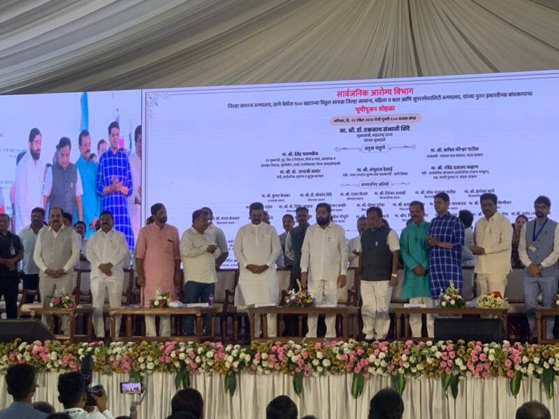 *🎴मुंबई, दि – २२:-* आज अक्षय तृतीया च्या शुभ मुहूर्तावर ठाणे जिल्हा मध्ये जिल्हा सामान्य रुग्णालय ठाणे येथील नवशे खाटांचे जिल्हा रुग्णालय आणि सुपर स्पेशालिटी रुग्णालयाच्या नूतन इमारतीच्या बांधकाम कामाचे भूमिपूजन सोहळा महाराष्ट्र राज्याचे मुख्यमंत्री एकनाथ शिंदे यांच्या हस्ते करण्यात आले. यावेळी केंद्रीय पंचायत राज्य मंत्री नामदार कपिल पाटील सार्वजनिक बांधकाम मंत्री नामदार रविंद्र चव्हाण आरोग्य मंत्री डॉ तानाजी सावंत नरेश म्हस्के माजी आरोग्य मंत्री डॉ दिपक सावंत आमदार संजय केळकर आमदार रमेश पाटील आमदार कुमार आयलानी आमदार रवींद्र फाटक जिल्हाधिकारी अशोक शिनगारे भाजपा शिव सेना युतीचे नगरसेवक सार्वजनिक बांधकाम आरोग्य विभाग मधील अधिकारी पदाधिकारी व कार्यकर्ते उपस्थित होते.