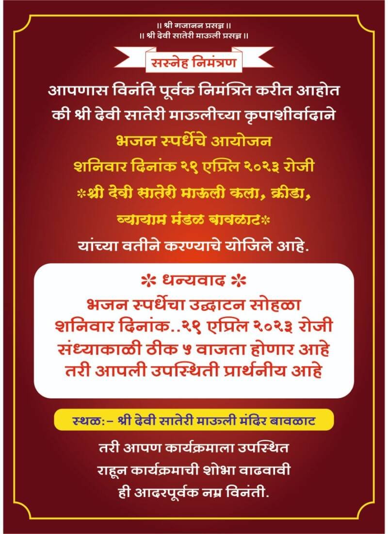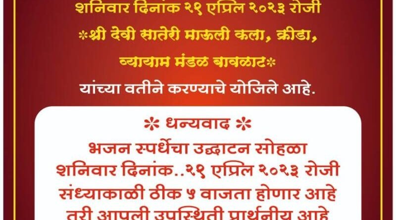 рдмрд╛рд╡рд│рд╛рдЯ рдпреЗрдереЗ реиреп рдПрдкреНрд░рд┐рд▓реирежреирей рд░реЛрдЬреА рд╢реНрд░реАрджреЗрд╡реА рд╕рд╛рддреЗрд░реА рдорд╛рдКрд▓реА рдХрд▓рд╛, рдХреНрд░реАрдбрд╛ рд╡ рд╡реНрдпрд╛рдпрд╛рдо рдордВрдбрд│ рдпрд╛рдВрдЪреНрдпрд╛ рд╡рддреАрдиреЗ рднрдЬрди рд╕реНрдкрд░реНрдзреЗрдЪреЗ рдЖрдпреЛрдЬрди рдХрд░рдгреНрдпрд╛рдд рдЖрд▓реЗ рдЖрд╣реЗ. рдпрд╛ рд╕реНрдкрд░реНрдзреЗрдЪреЗ рдЙрджреНрдШрд╛рдЯрди рд╢реНрд░реАрджреЗрд╡реА рд╕рд╛рддреЗрд░реА рдорд╛рдКрд▓реА рдордВрджрд┐рд░ рдмрд╛рд╡рд│рд╛рдЯ рдпрд╛ рдард┐рдХрд╛рдгреА рд╕рдВрдзреНрдпрд╛рдХрд╛рд│реА рдкрд╛рдЪ рд╡рд╛рдЬрддрд╛ рдХрд░рдгреНрдпрд╛рдд рдпреЗрдИрд▓. рд╕реНрдкрд░реНрдзреЗрд╕рд╛рдареА рдкреНрд░рдердо рдкрд╛рд░рд┐рддреЛрд╖рд┐рдХ рд░реЛрдЦ рд░рдХреНрдХрдо ренрежрежрез рд░реБрдкрдпреЗ рд╡ рдЖрдХрд░реНрд╖рдХ рдЪрд╖рдХ, рджреНрд╡рд┐рддреАрдп рдкрд╛рд░рд┐рддреЛрд╖рд┐рдХ рд░реЛрдЦ рд░рдХреНрдХрдо релрежрежрезрд╡ рдЖрдХрд░реНрд╖рдХ рдЪрд╖рдХ, рддреГрддреАрдп рдкрд╛рд░рд┐рддреЛрд╖рд┐рдХ рейрежрежрезрд╡ рдЖрдХрд░реНрд╖рдХ рдЪрд╖рдХ,рдЙрддреНрддреЗрдЬрдирд╛рд░реНрде резрежрежрез рд╡ рдЖрдХрд░реНрд╖рдХ рдЪрд╖рдХ, рддрд╕реЗрдЪ рджреЗрд╡реАрдЪреНрдпрд╛ рдорд╣рддреАрд╡рд░реАрд▓ рдЧрдЬрд░рд╛рдЪреНрдпрд╛ рдЙрддреНрдХреГрд╖реНрдЯ рд╕рд╛рджрд░реАрдХрд░рдгрд╛рд▓рд╛ резрежрежрез рд░реБрдкрдпреЗ рд╡ рдЖрдХрд░реНрд╖рдХ рдЪрд╖рдХ рджреЗрдгреНрдпрд╛рдд рдпреЗрдИрд▓. рддрд╕реЗрдЪ рдЙрддреНрдХреГрд╖реНрдЯ рдЧрд╛рдпрдХ, рдкрдЦрд╡рд╛рдЬ рддрдмрд▓рд╛, рдЭрд╛рдВрдЬ рд╡ рдХреЛрд░рд╕ рдпрд╛рдВрдирд╛ рд╡реИрдпрдХреНрддрд┐рдХ рдмрдХреНрд╖рд┐рд╕реЗ рджреЗрдгреНрдпрд╛рдд рдпреЗрддреАрд▓. рдпрд╛ рднрдЬрди рд╕реНрдкрд░реНрдзреЗрдордзреНрдпреЗ рдУрдо рдЖрджрд┐рдирд╛рде рд╕рд┐рджреНрдз рдорд╣рд╛рдкреБрд░реБрд╖ рдорд╣рд┐рд▓рд╛ рднрдЬрди рдордВрдбрд│ рдЬрд╛рдгрд╡рд▓реА рдХрдгрдХрд╡рд▓реА рдпреЗрдереАрд▓ рдмреБрд╡рд╛ рдХреБ рджрд┐рд╡реНрдпрд╛ рд░рд╛рдЬреЗрдВрджреНрд░ рдЧреЛрд╕рд╛рд╡реА, рд╢реНрд░реАрджреЗрд╡реА рд╕рд╛рддреЗрд░реА рдкреНрд░рд╕рд╛рджрд┐рдХ рднрдЬрди рдордВрдбрд│ рд╕рд╛рддреБрд│реА рдмреБрд╡рд╛ рд╢реНрд░реА рдЕрдирд┐рд▓ рдкрд░рдм,рд╕рджреНрдЧреБрд░реБ рд╕рдВрдЧреАрдд рднрдЬрди рдХреБрдбрд╛рд│, рдмреБрд╡рд╛ рд╕реБрдпрд╢ рдкрд╛рд▓рдХрд░, рдирд╡рдирд╛рде рдпреБрд╡рдХ рднрдЬрди рдордВрдбрд│ рдорд╛рдгрдЧрд╛рд╡ рдмреБрд╡рд╛ рдУрдВрдХрд╛рд░ рдХреБрдВрднрд╛рд░, рд╢реНрд░реАрджреЗрд╡реА рдЗрд╕реЛрдЯреА рднрдЬрди рдордВрдбрд│ рдорд╛рддреЛрдВрдб (рд╕рд╛рд╡рдВрддрд╡рд╛рдбрд╛) рдмреБрд╡рд╛ рд╕рдЪрд┐рди рд╕рд╛рд╡рдВрдд, рд╢реНрд░реАрджреЗрд╡реА рд▓рд┐рдВрдЧреЗрд╢реНрд╡рд░ рдкрд╛рд╡рдгрд╛рджреЗрд╡реА рдкреНрд░рд╛рд╕рд╛рджрд┐рдХ рднрдЬрди рдордВрдбрд│ рдЕрд╕рд░реЛрдВрдбреА рдмреБрд╡рд╛ рд╡рд┐рд╢рд╛рд▓ рд╕рд╛рд╡рдВрдд, рд░рд╡рд│рдирд╛рде рдкреНрд░рд╛рд╕рд╛рджрд┐рдХ рднрдЬрди рдордВрдбрд│ рдкрд┐рдВрдЧреБрд│реА рдмреБрд╡рд╛ рд╢реНрд░реА рд░реБрдкреЗрд╢ рдпрдордХрд░, рд╕рджреНрдЧреБрд░реБ рдкреНрд░рд╛рд╕рд╛рджрд┐рдХ рднрдЬрди рдордВрдбрд│ рддреБрд│рд╕ рд╡рдбрдЦреЛрд▓ рдмреБрд╡рд╛ рд╢реНрд░реА рдкреБрд░реБрд╖реЛрддреНрддрдо рдкрд░рдм рд╣реЗ рдЖрдкрд▓реА рдХрд▓рд╛ рд╕рд╛р