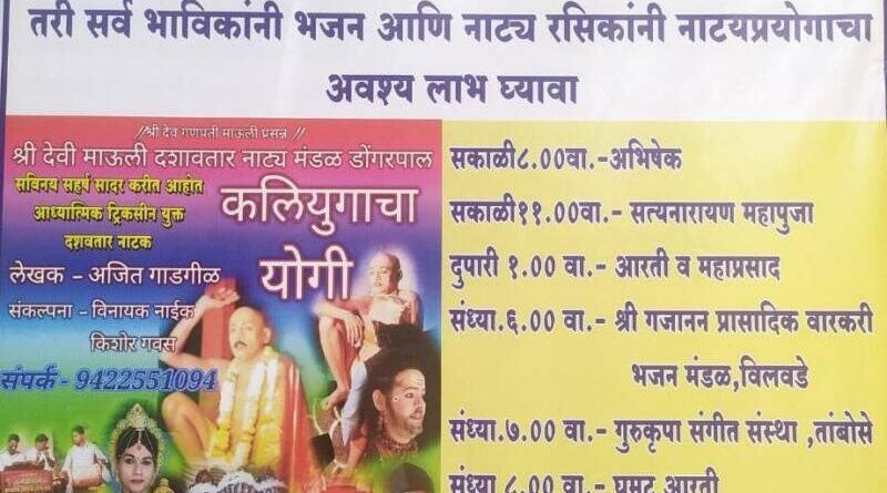 рд░рд╛рддреНрд░реА рдареАрдХ рео рд╡рд╛рдЬрддрд╛ рдШреБрдордЯ рдЖрд░рддреА, рд░рд╛рддреНрд░реА реп.рейреж рд╢реНрд░реА рджреЗрд╡реА рдорд╛рдКрд▓реА рджрд╢рд╛рд╡рддрд╛рд░ рдирд╛рдЯреНрдп рдордВрдбрд│,рдбреЛрдВрдЧрд░рдкрд╛рд▓ рдпрд╛рдВрдЪрд╛ рдХрд▓рд┐рдпреБрдЧрд╛рдЪрд╛ рдпреЛрдЧреА рд╣рд╛ рдирд╛рдЯреНрдпрдкреНрд░рдпреЛрдЧ рд╣реЛрдгрд╛рд░ рдЖрд╣реЗ.