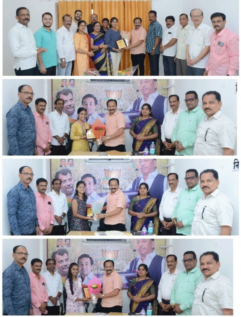 *🎴कणकवली, दि-०३:-* कणकवली शहरातील दहावीच्या परीक्षेत उत्तीर्ण झालेल्या गुणवंत विद्यार्थ्यांचा सत्कार कणकवली नगरीचे माजी नगराध्यक्ष समीर नलावडे यांच्या हस्ते सन्मान चिन्ह व पुष्पगुच्छ देत करण्यात आला. यामध्ये कणकवलीतील श्रावणी शिखरे (९८ टक्के), सृष्टी जोगळे (९६.४० टक्के) गुण मिळवत गुणवत्ता यादीत येण्याचा मान मिळवला. त्यासोबतच दहावीच्या परीक्षेत यश मिळवलेल्या स्वानंदी कोदे (८९.४० टक्के) आर्या डेगवेकर (८८.४० टक्के) यांचा देखील यावेळी सन्मानचिन्ह देऊन सत्कार करण्यात आला. या सत्कार प्रसंगी श्रीवल्लभ शिखरे व त्यांचे कुटुंबीय तसेच माजी नगरसेवक तथा राष्ट्रवादी नेते अबीद नाईक, रवींद्र गायकवाड, संजय कामतेकर, अभिजीत मुसळे, मेघा गांगण, बंडू गांगण, शहराध्यक्ष अण्णा कोदे, महेंद्र मुरकर, किशोर राणे आदी उपस्थित होते.