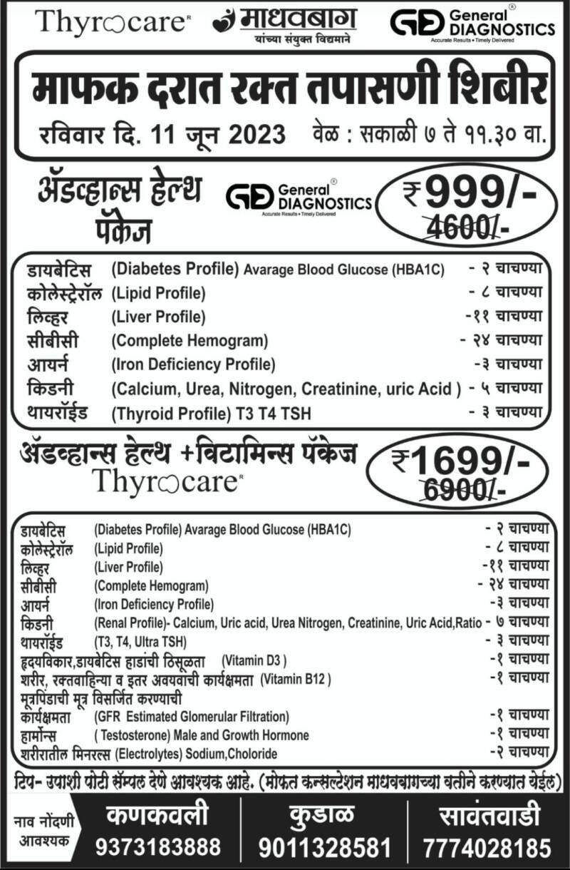 जनरल डायग्नोस्टिक, थायरोकेअर, व माधवबाग यांच्या संयुक्त विद्यमाने हृदयरोग मधुमेह, पॅरालिसिस, लिव्हर चे विकार, थायरॉईड ग्रंथींचे विकार, ऍनिमिया, हार्मोन्स आदी आजरांवर माफक दरात रक्त तपासणी शिबीर रविवार 11 जून रोजी सकाळी 7 ते सकाळी 11 :30 वाजेपर्यंत आयोजित करण्यात आले आहे. या शिबिरात ऍडव्हान्स हेल्थ पॅकेजनुसार 4600 रु.ऐवजी फक्त 999 रुपयांत डायबेटीज च्या दोन चाचण्या, कोलेस्ट्रॉल च्या 8 चाचण्या, लिव्हर च्या 11 चाचण्या, सीबीसी च्या 24 चाचण्या, आयर्न च्या 3 चाचण्या, किडनी च्या 5 चाचण्या, थायरॉईड च्या 3 चाचण्या केल्या जाणार आहेत. तसेच ऍडव्हान्स हेल्थ प्लस व्हिटामिन पॅकेज मध्ये 6,900 रु.ऐवजी फक्त 1699 रु.मध्ये डायबेटीज च्या 2 चाचण्या, कोलेस्ट्रॉल च्या 8 चाचण्या, लिव्हर च्या 11 चाचण्या, सीबीसी 24 चाचण्या, आयर्न च्या 3 चाचण्या, किडनी च्या 7 चाचण्या, थायरॉईड च्या 3 चाचण्या, हृदयविकार डायबेटीज हाडांची ठिसूळता 1 चाचणी, शरीर रक्तवाहिन्या व इतर अवयवांची कार्यक्षमता 1 चाचणी, मूत्रपिंडाची मूत्र विसर्जित करण्याची कार्यक्षमता 1 चाचणी, हार्मोन्स 1 चाचणी, शरीरातील मिनरल्स 2 चाचण्या केल्या जाणार आहेत. यासाठी उपाशीपोटी सॅम्पल द्यावे लागेल. मोफत कन्सल्टेशन माधवबाग च्या वतीने केले जाणार आहे.यासाठी नावनोंदणी आवश्यक असून कणकवली मोबा.9373183888, कुडाळ मोबा. 9011328581, सावंतवाडी मोबा.7774028185 वर नावनोंदणी करावी. सूचना उपाशीपोटी सॅम्पल द्यावे