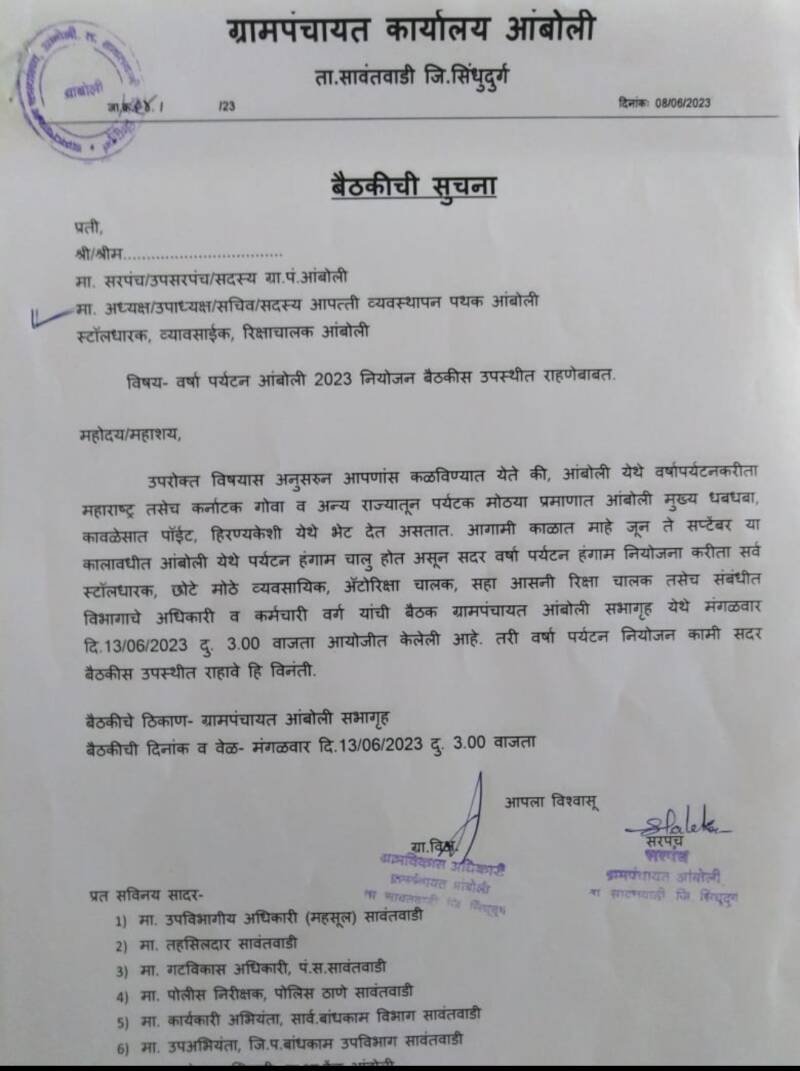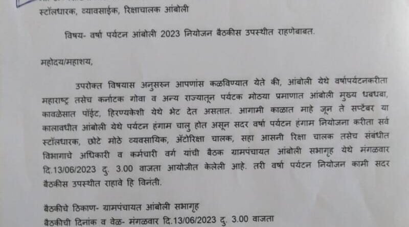 2023 च्या पर्यटन हंगामासाठी आंबोली ग्रामपंचायत कडून सर्व पर्यटक व्यवसायिक तसेच आंबोलीतील रिक्षाव्यवसायिक व इतर वाहन व्यवसायिक यांची बैठक दिनांक १३जून २०२३ रोजी दुपारी ३.००वाजता ग्रामपंचायत कार्यालयात आयोजित करण्यात आली आहे. आंबोलीतील वर्षा पर्यटनासाठी कर्नाटक, गोवा व महाराष्ट्रातून मोठ्या प्रमाणात पर्यटक हजेरी लावतात. बरेच आंबोलीतील युवक रोजगारासाठी या वर्षा पर्यटनावर अवलंबून आहेत. मात्र अनेक वेळा नियोजना अभावी वाहतुकीची कोंडी होण्याचे प्रकार, पर्यटकांबरोबर वादावादीचे प्रकार घडत असतात. याने आंबोली वर्षा पर्यटनाची होणारी बदनामी दूर करण्यासाठीच या बैठकीचे आयोजन करण्यात आले असून यासाठी महसूल विभाग, पोलीस निरीक्षक ,सार्वजनिक बांधकाम विभाग यांच्या प्रतिनिधी सह या बैठकीचे आयोजित करण्यात आले असून पर्यटकांना कोणत्याही प्रकारचा त्रास होणार नाही, तसेच व्यावसायिकांना सुद्धा प्रशासनाकडून चांगले सहकार्य मिळावे जेणेकरून आंबोली वर्षापर्यटनाला कोणतेही गालबोट लागणार नाही याची काळजी घेता येईल. असे आवाहन आंबोली सरपंच व ग्रामपंचायतीच्या वतीने करण्यात आले आहे.