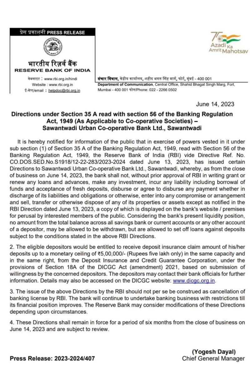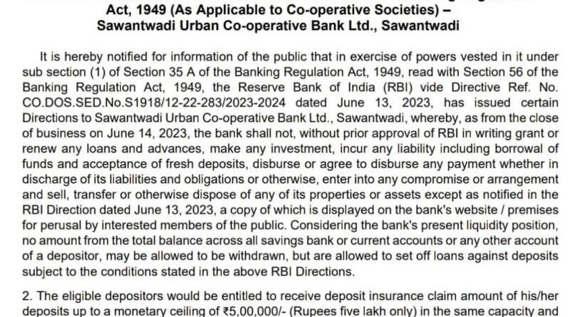 ЁЯЯе рд╕рд╛рд╡рдВрддрд╡рд╛рдбреА рдЕрд░реНрдмрди рдмрдБрдХреЗрд╡рд░ RBI рдЪреЗ рдирд┐рд░реНрдмрдВрдз