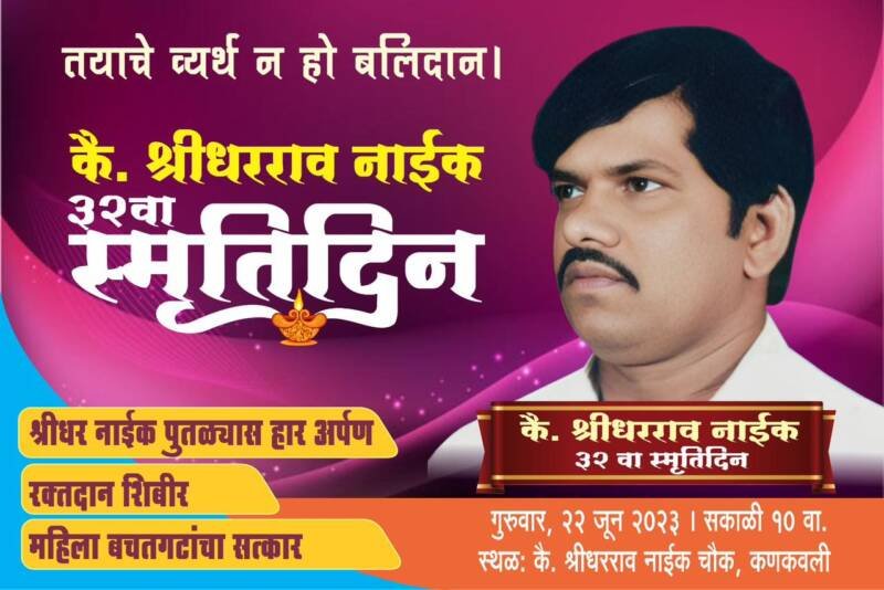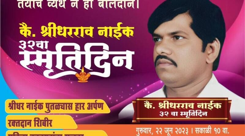 *🎴कणकवली, दि-२०:-* कै. श्रीधरराव नाईक यांचा ३२ वा स्मृतीदिन गुरुवार २२ जून २०२३ रोजी सकाळी १० वाजता कणकवली येथील कै. श्रीधरराव नाईक चौक येथे साजरा करण्यात येणार आहे. यानिमित्त सकाळी १० वाजता कै. श्रीधरराव नाईक यांच्या पुतळयास पुष्पहार अर्पण करण्यात येणार आहे. तसेच रक्तदान शिबीर व महिला बचत गटांचा सत्कार करण्यात येणार आहे.