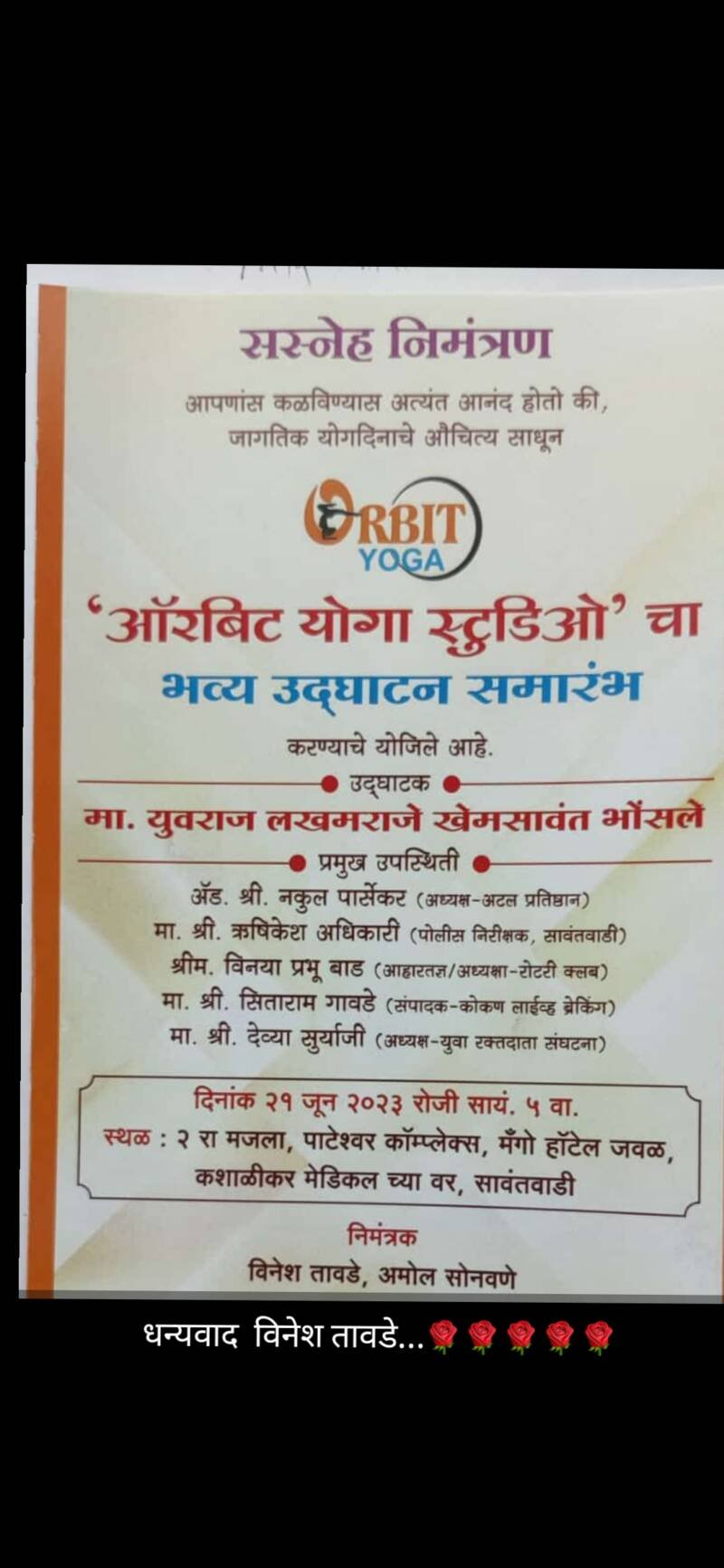 सावंतवाडी, दि.२१:- जागतिक योग दिनाचे औचित्य साधून ऑरबीट योगा स्टुडिओ चा शुभारंभ आज सायंकाळी ५ वाजता पाटेश्वर कॉम्प्लेक्स मँगो हॉटेल जवळ सावंतवाडी येथे होणार आहे. ह्या कार्यक्रमाला उदघाटक म्हणून युवराज लखमराजे खेमसावंत भोसले असणार आहे आहेत तसेच प्रमुख उपस्थिती म्हणून अटल प्रतिष्ठान चे अध्यक्ष अँड नकुल पार्सेकर, पोलीस निरीक्षक ऋषिकेश अधिकारी, रोटरी क्लब अध्यक्षा विनया प्रभू बाड, कोकण लाईव्ह ब्रेकिंग न्युज चॅनेल संपादक सीताराम गावडे, युवा रक्तदाता संघटना अध्यक्ष देव्या सूर्याजी आदी उपस्थित राहणार आहेत. सर्वांनी ह्या कार्यक्रमाला उपस्थित रहावे असे आवाहन विनेश गावडे आणि अमोल सोनावणे यांनी केले आहे.